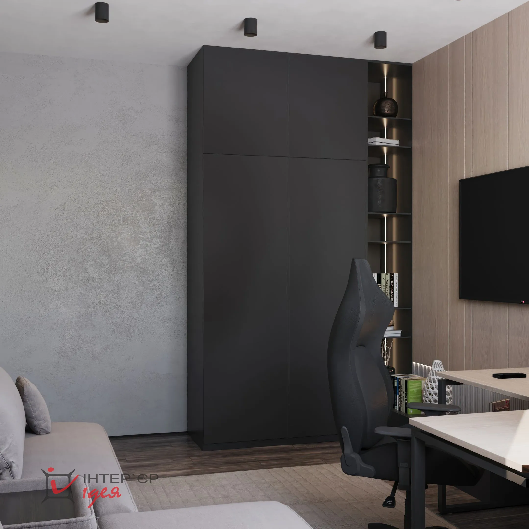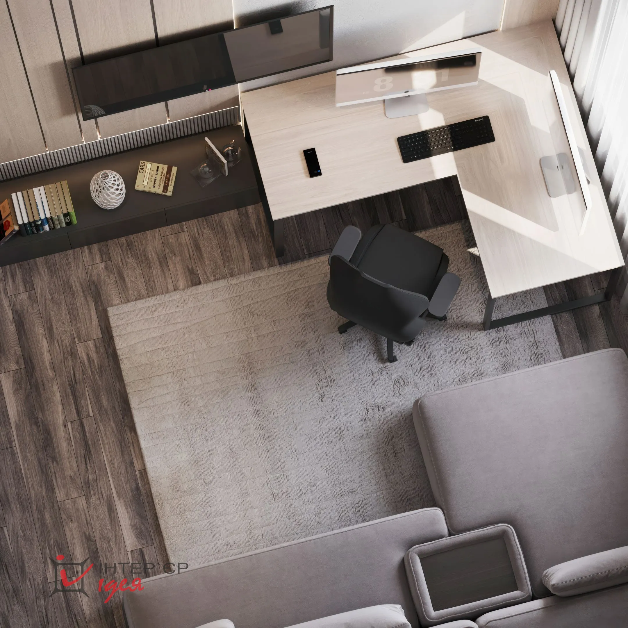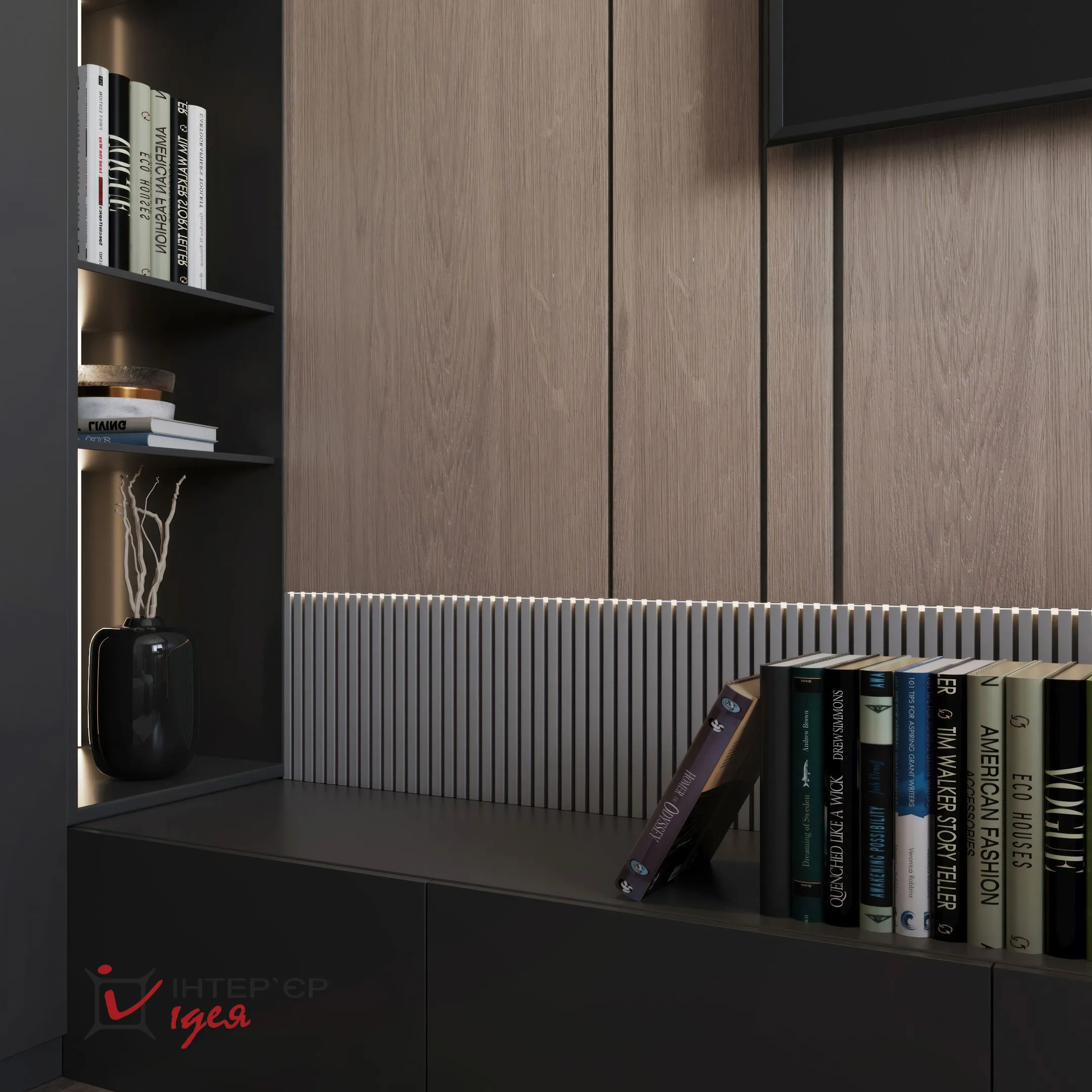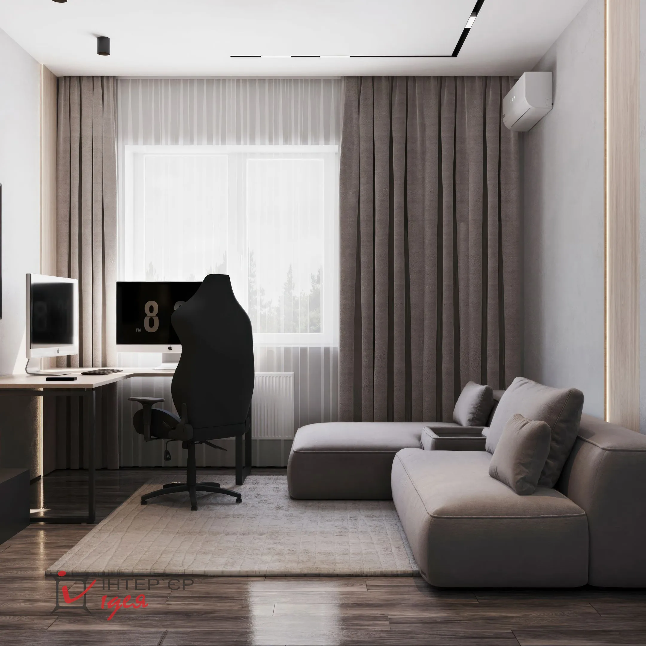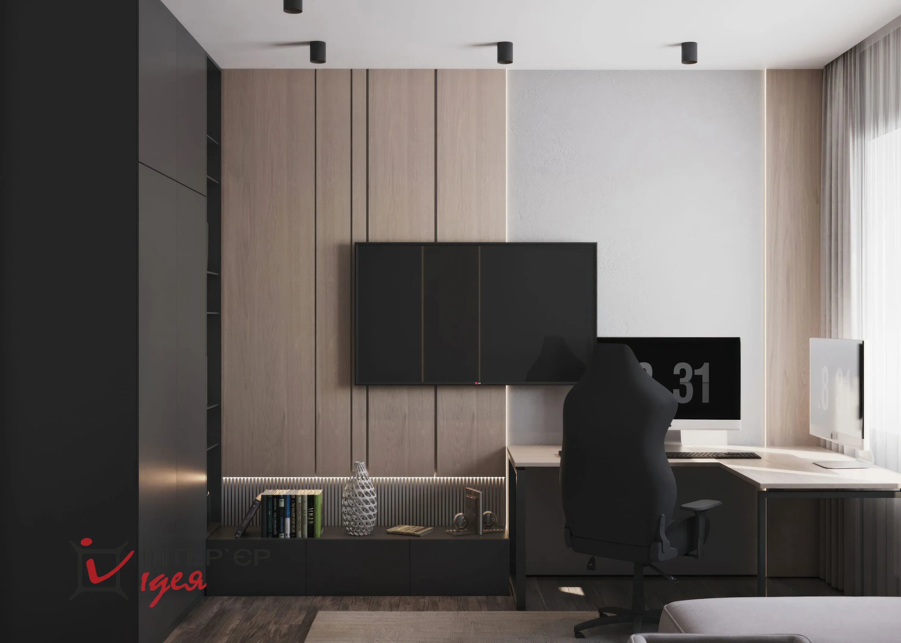 На стене использованы деревянные панели 3Д с LED подсветкой. Окно обрамлено легкими серыми шторами, пропускающими мягкий естественный свет, создавая комфортную атмосферу для работы.