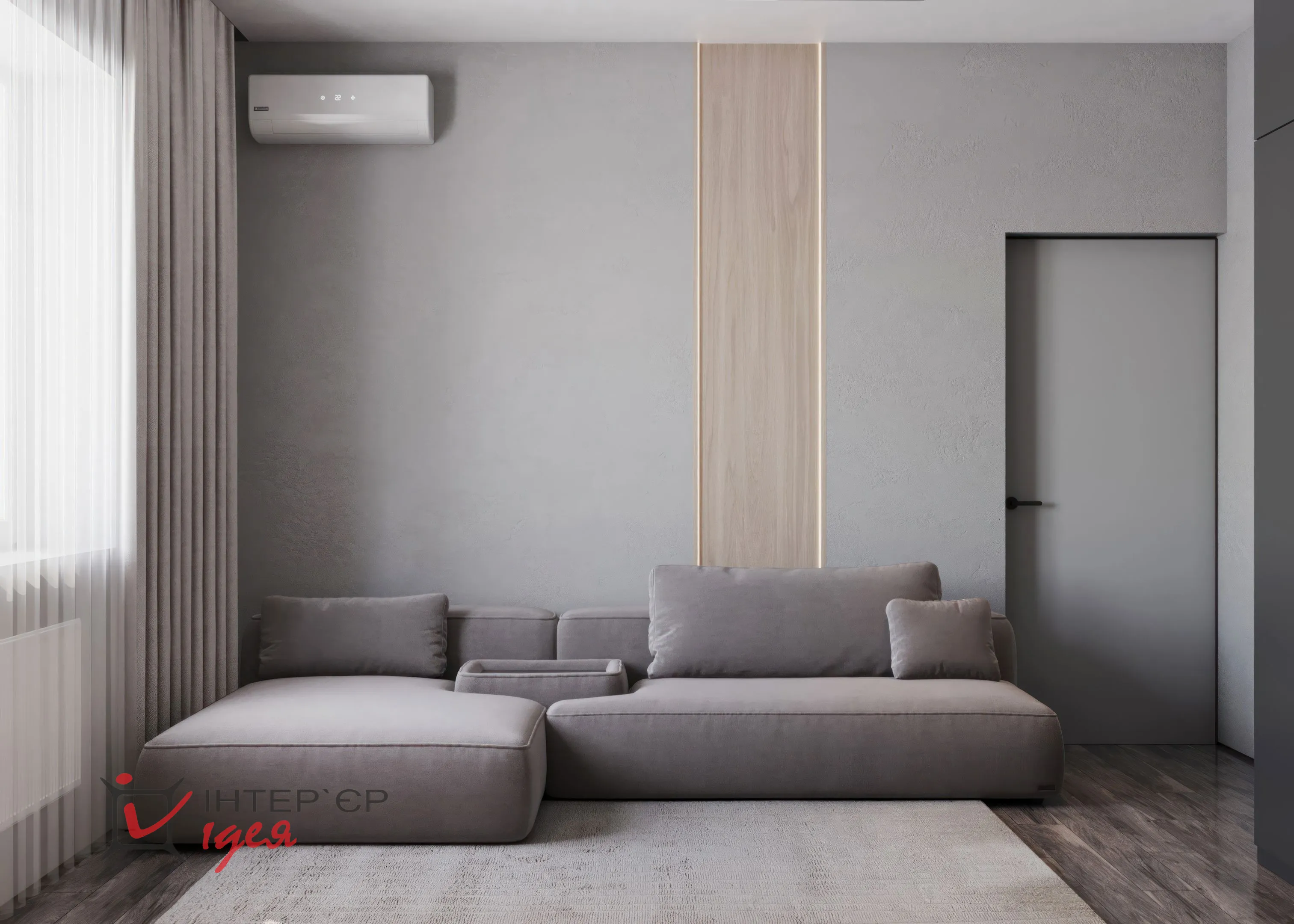 Стены отделаны светло-серой декоративной штукатуркой, визуально расширяющей пространство. На полу лежит мягкий ковер в светло-сером оттенке, придающий тепла.