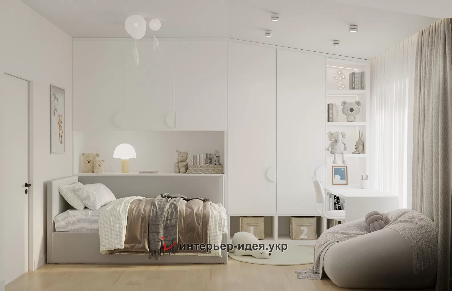 Основная цветовая гамма интерьера детской – белый с добавлением серого.