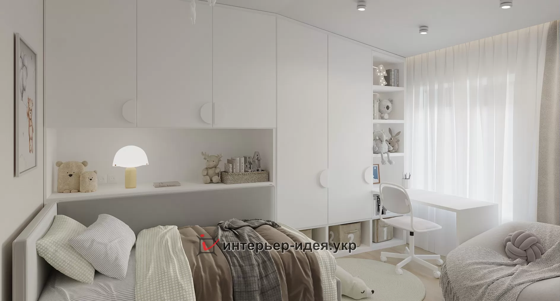 Рабочий стол расположен перед окном. Под соседней стеной – вместительные шкафы как для одежды, так и открытые полки для игрушек и книг. Шкафы вдоль всей стены обеспечат достаточно места для хранения одежды