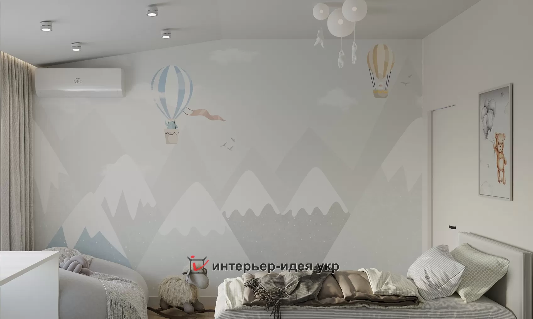 Чтобы добавить комнате игрового, интересного настроения, одна из стен оформлена фотообоями со спокойным рисунком, стена над кроватью украшена картиной, а на потолке – подвесные светильники в виде забавных мишек, летающих на воздушных шарах.