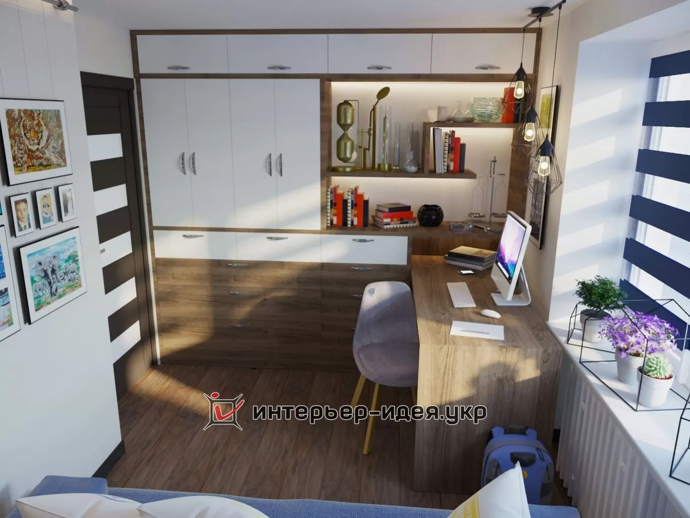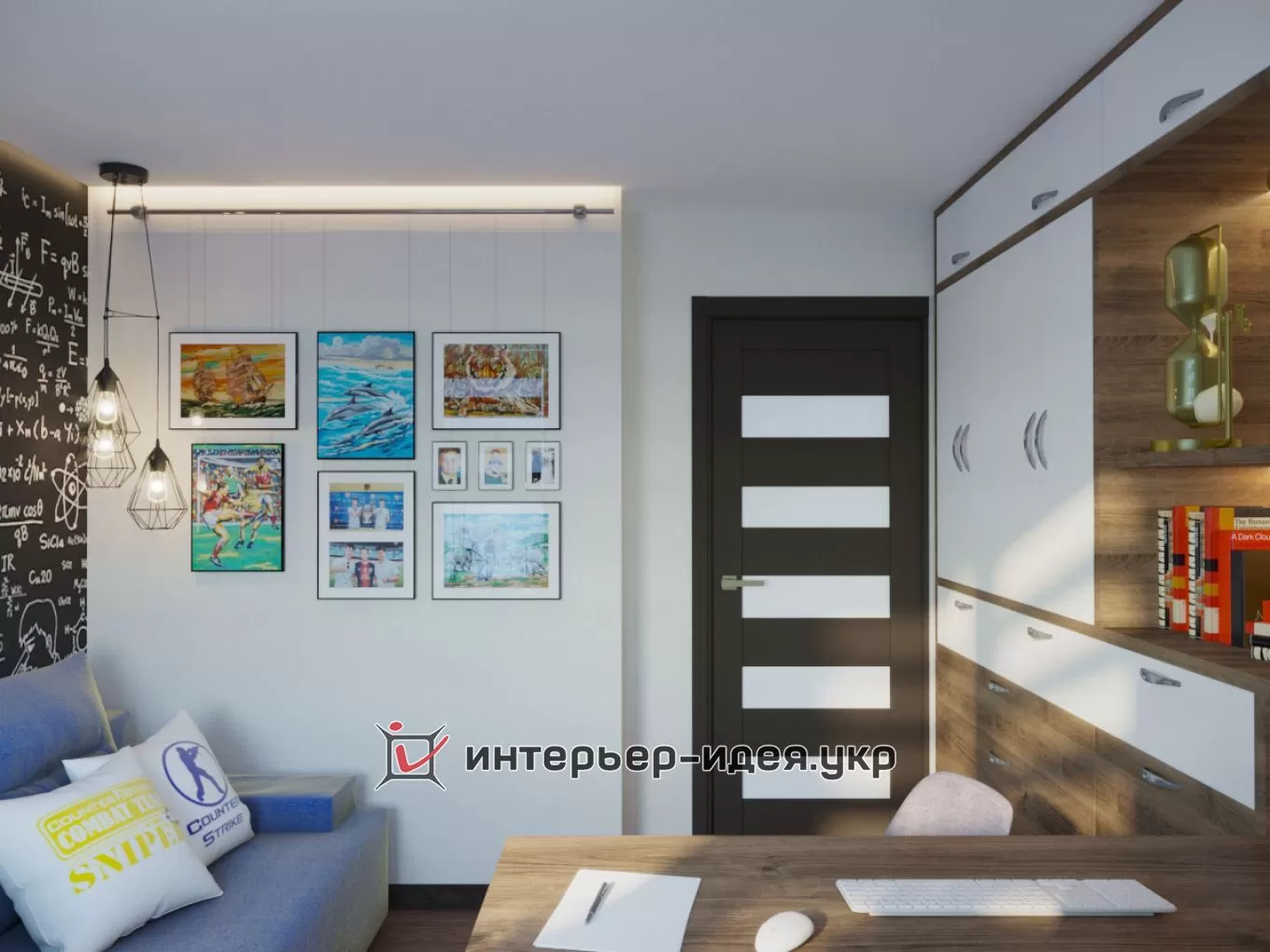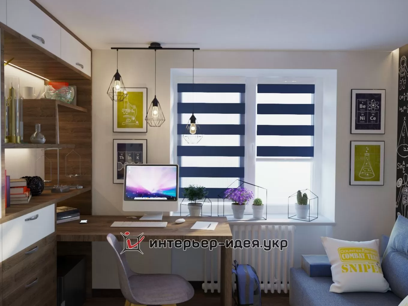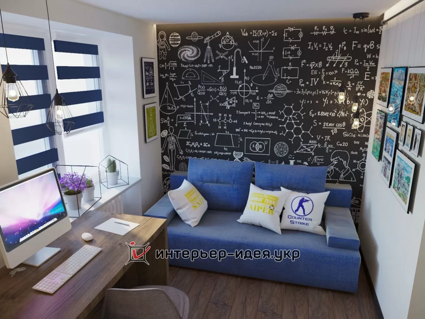 В интерьере использовали фотообои “Таблица научного сотрудника” для стены, вдоль которой стоит диван (Marta фирмы Pufetto, 2000х1000 мм.), а для других стен - декоративную штукатурку белого цвета. Для пола подобрали ламинат темного цвета Quick Step Largo, а плинтус из МДФ под цвет двери. Шкаф и письменный стол будут сделаны под заказ из МДФ двух цветов. Конфигурация шкафа являет собой сборную конструкцию из открытых и закрытых секций. На открытых полках хозяин комнаты сможет разместить все принадлежности для опытов и занятия наукой. В поддержку общей тематики разместили постеры с изображением пробирок, микроскопа и разных атрибутов научного мира. Также, мы учли увлечение рисованием и разместили трубу, на которой можно подвесить свои рисунки, фото, грамоты. Осветительные приборы выбрали фирмы Eglo. На окнах предлагаем рулонные шторы “День - ночь” с синей полоской в цвет дивана.