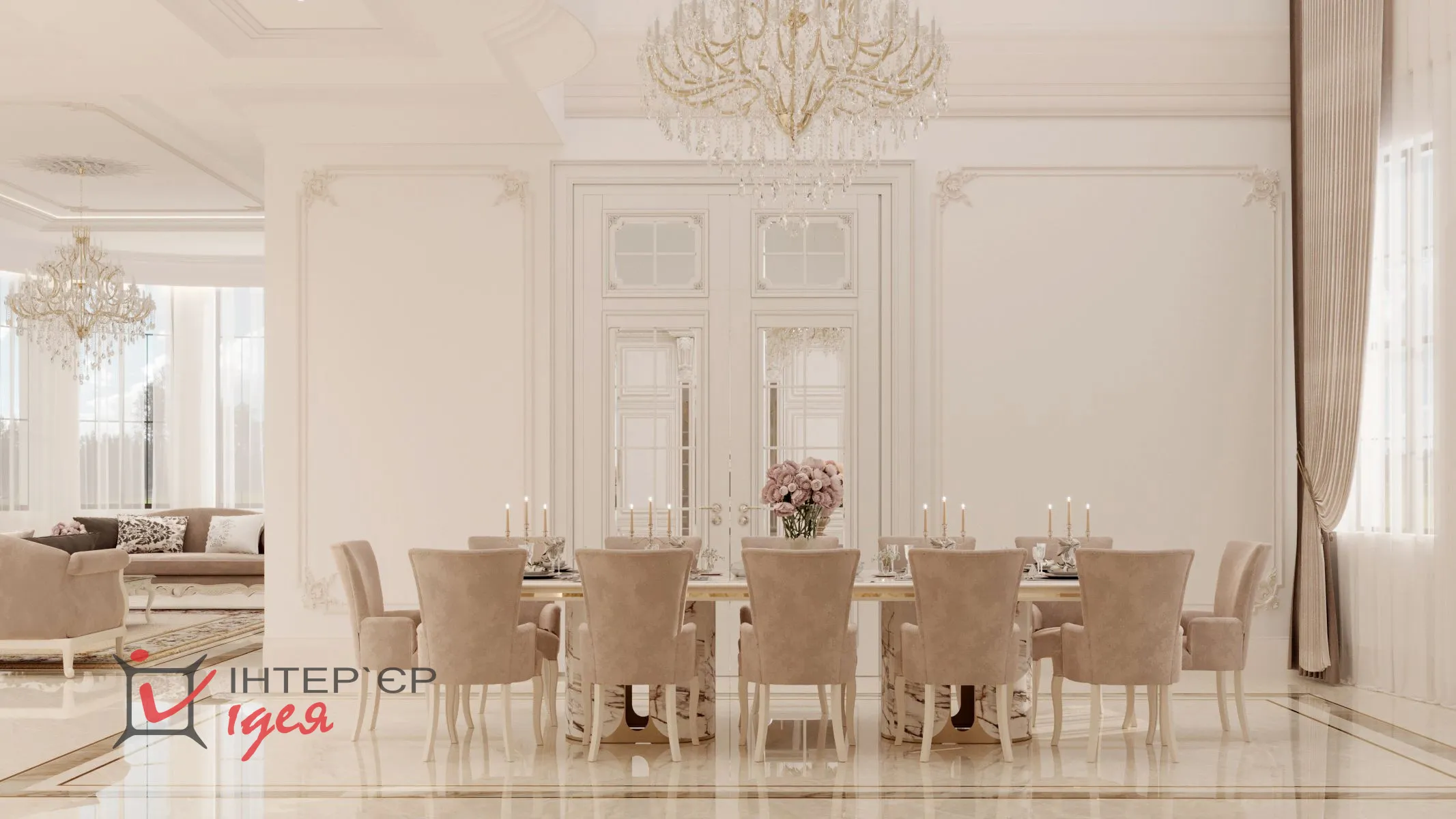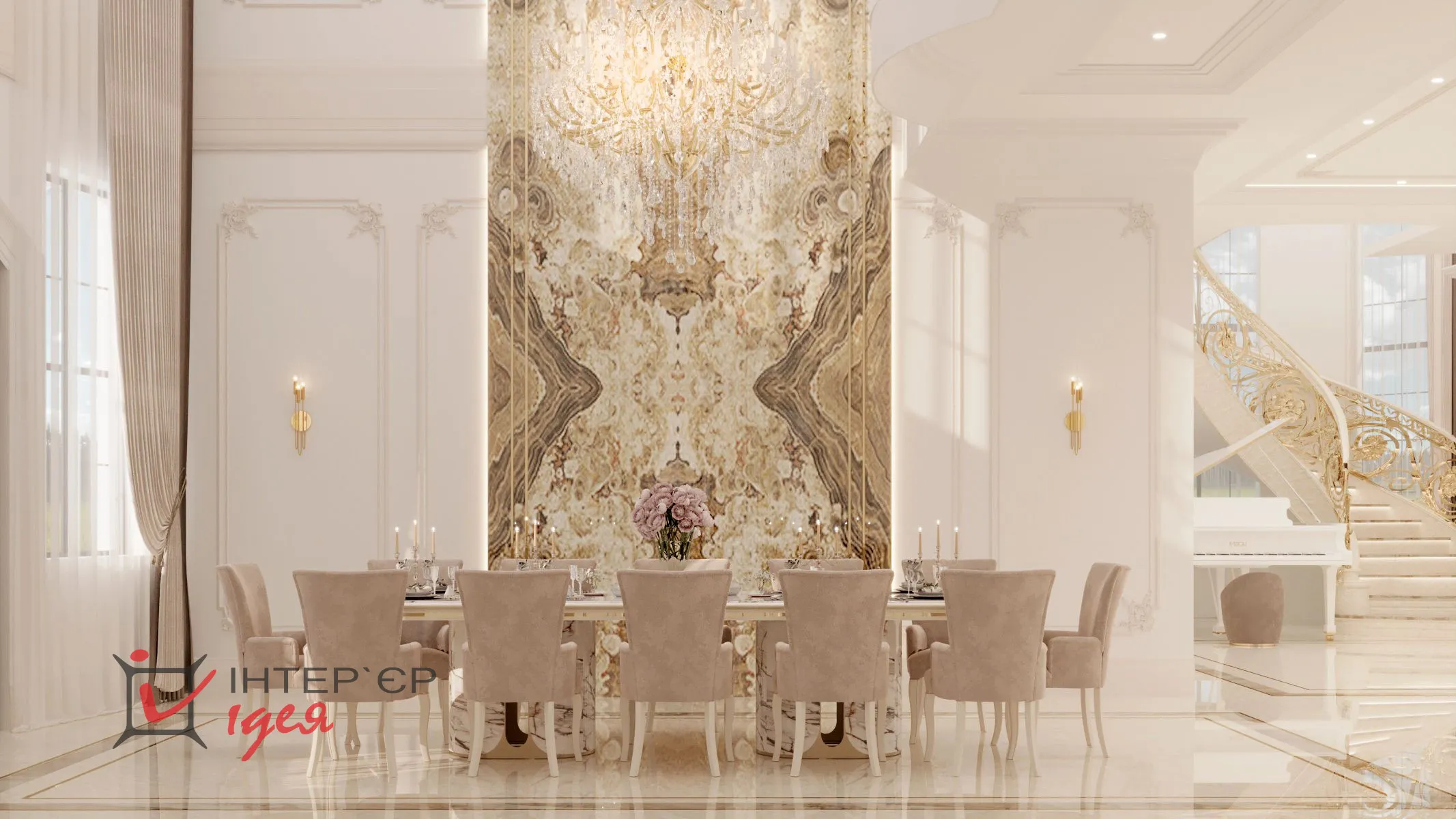 В зоне столовой создан второй свет и высота потолка достигает более 6,5 метров. Подчеркивая высокие деревни, мы объединили различные виды освещения: большие, роскошные люстры из хрусталя и позолоты, настенные бра из люксовой коллекции и декоративные LED подсветки. Таким образом, мы подчеркнули масштабность помещений.