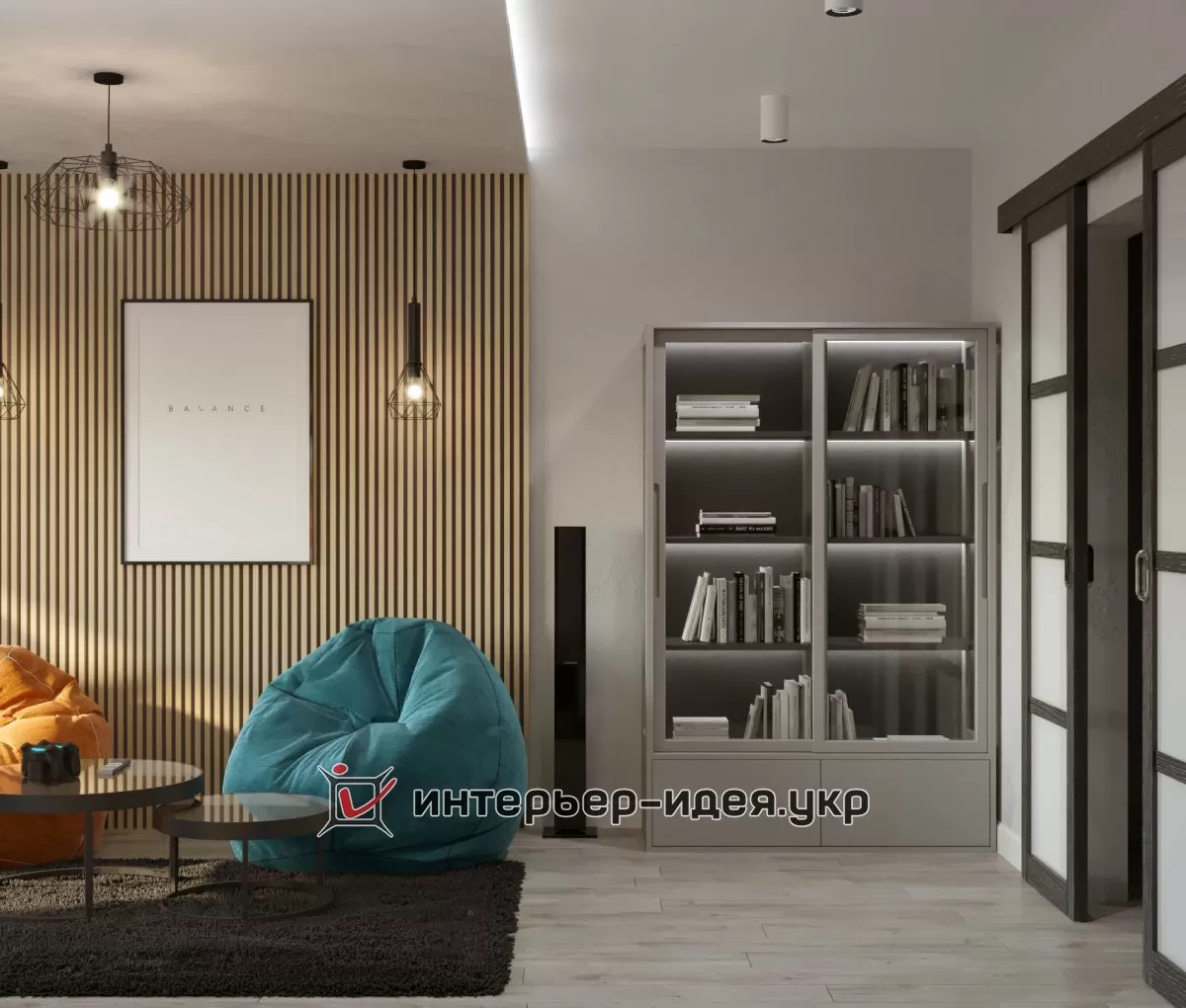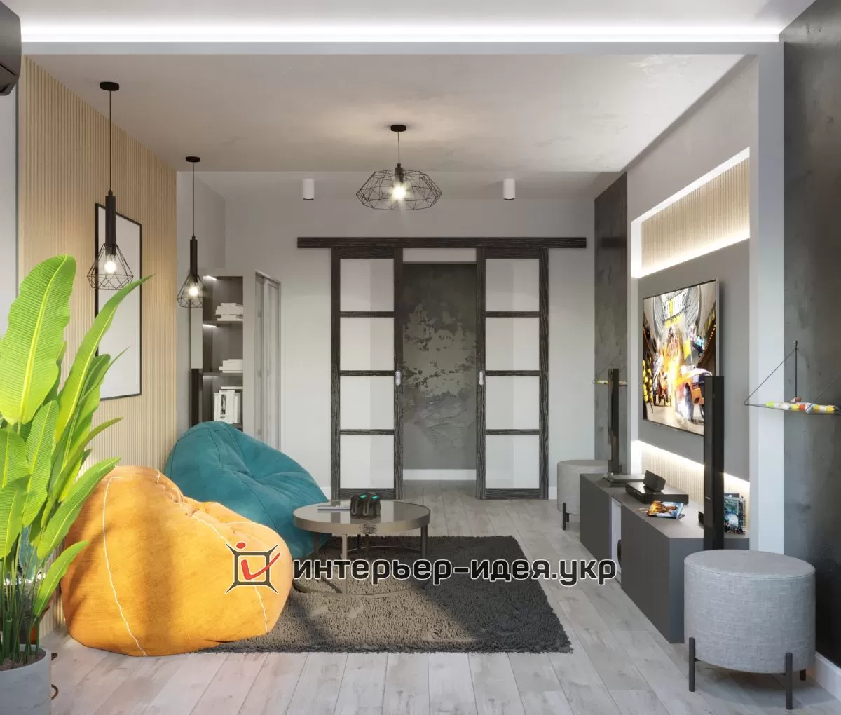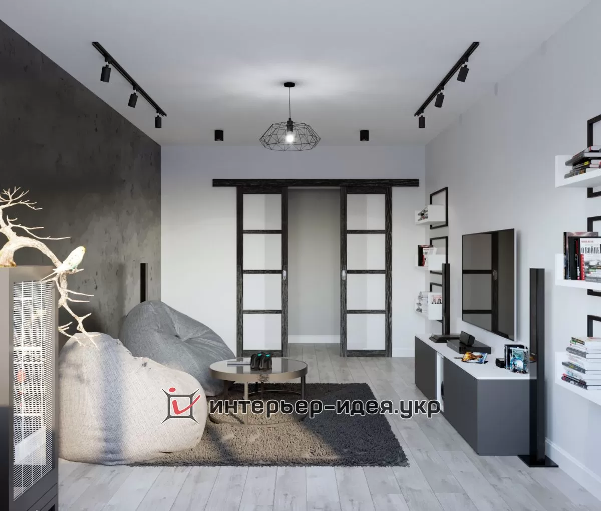 В жизни в эту комнату поступает очень мало дневного света, что бы исправить эту ситуацию было решено сделать стены в белом цвете, а так же за счет искусственного освещения удалось сделать комнату достаточно светлой.