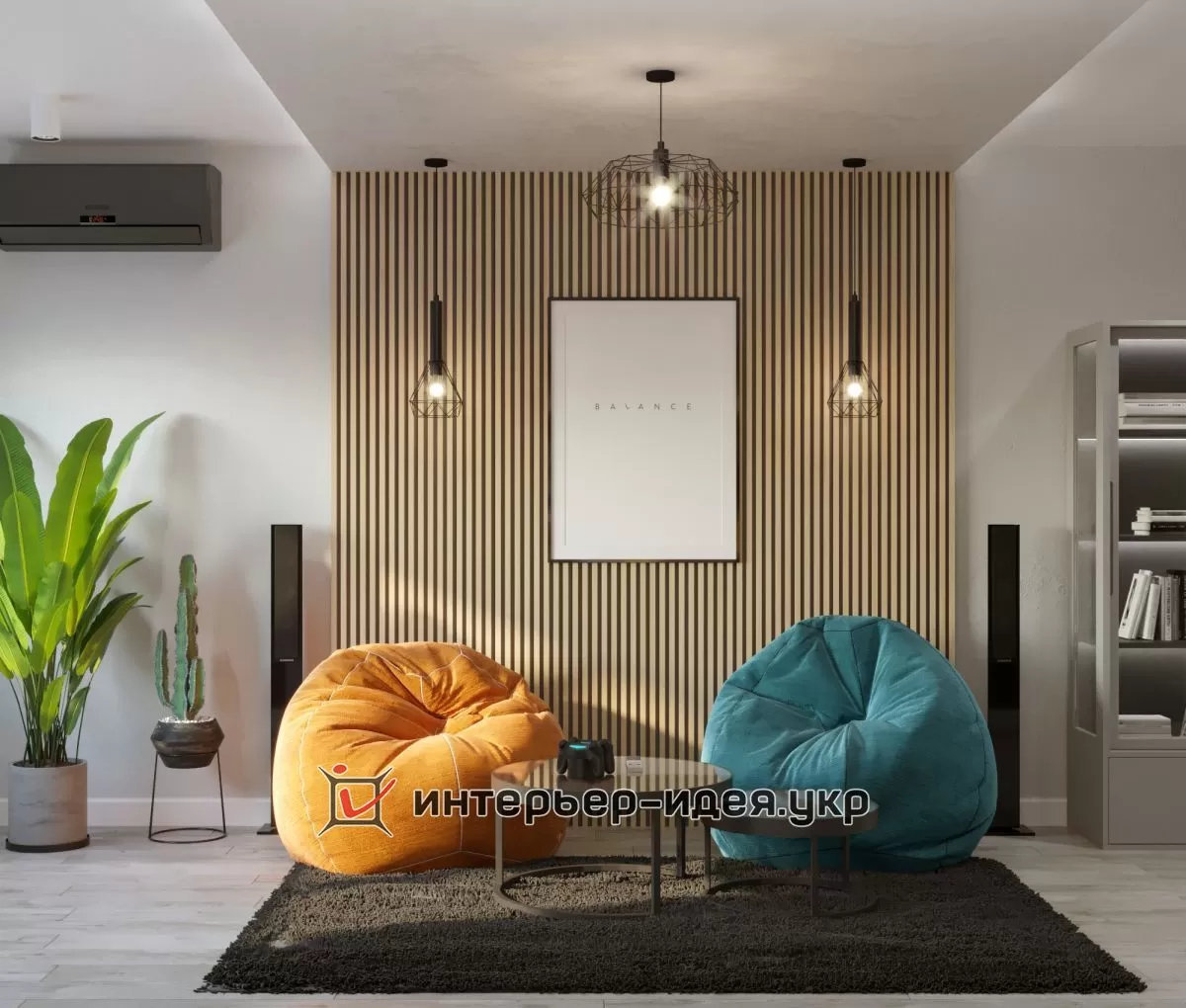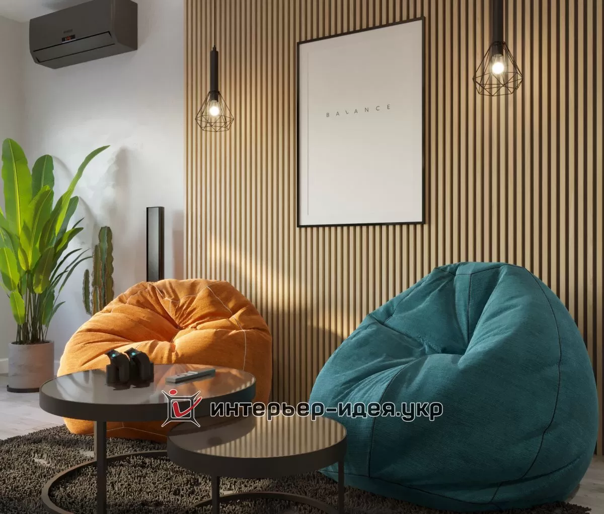 Что бы разбавить черно-белые цвета решили внести красок в интерьер за счет акцентных кресл груш.