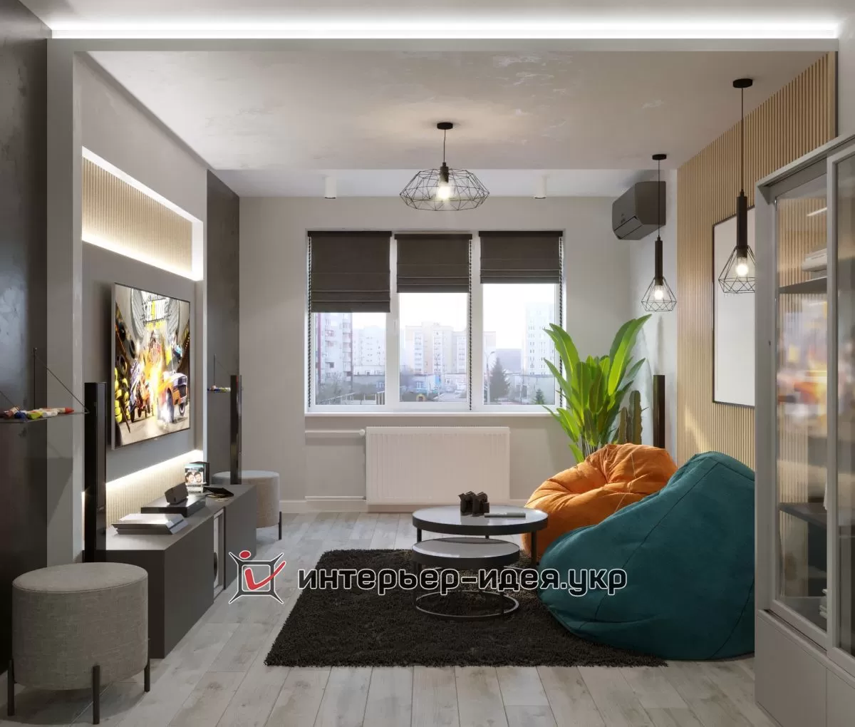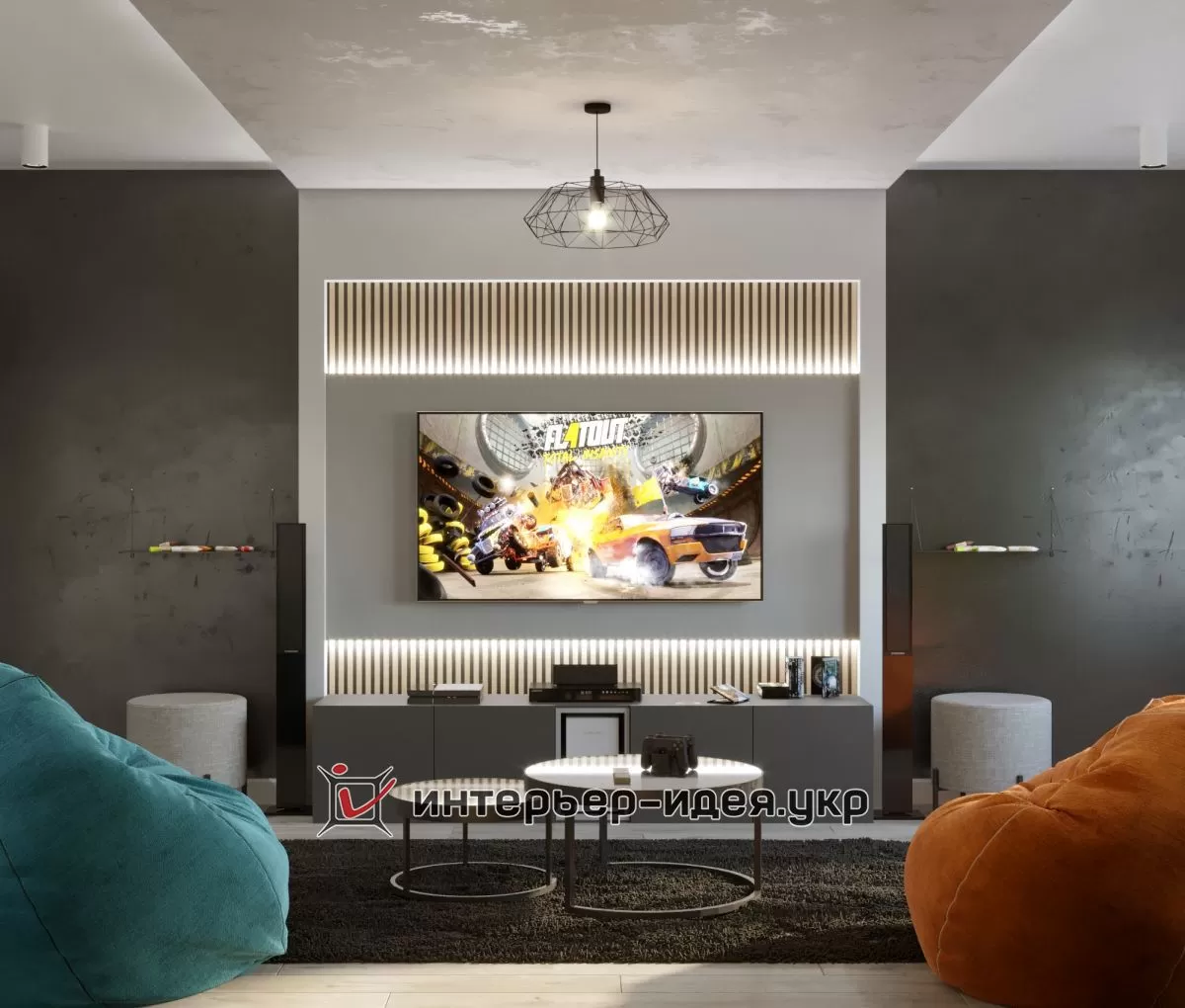 Центральная зона ТВ, выделена гипсокартонной конструкцией с деревянными рейками.