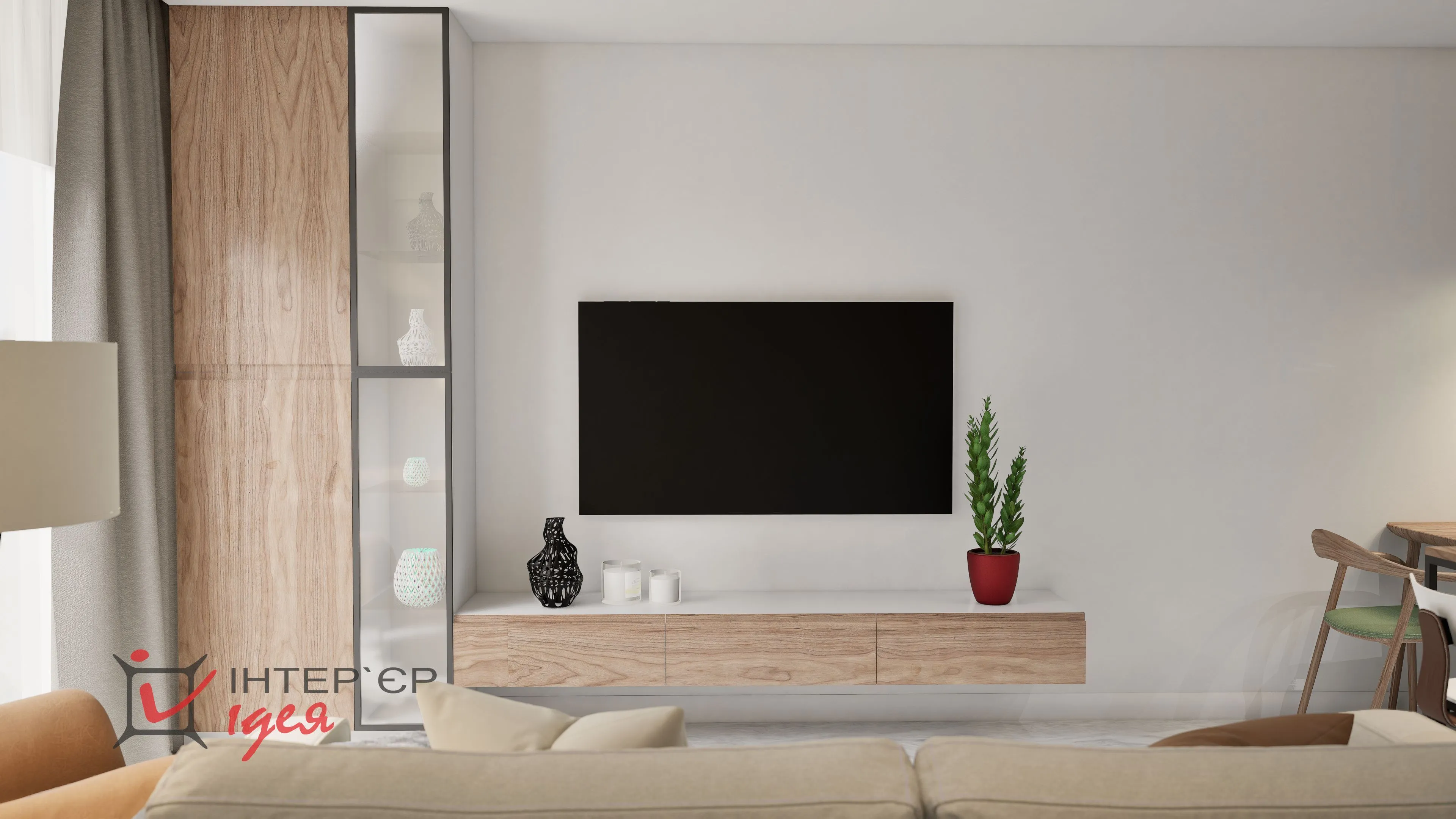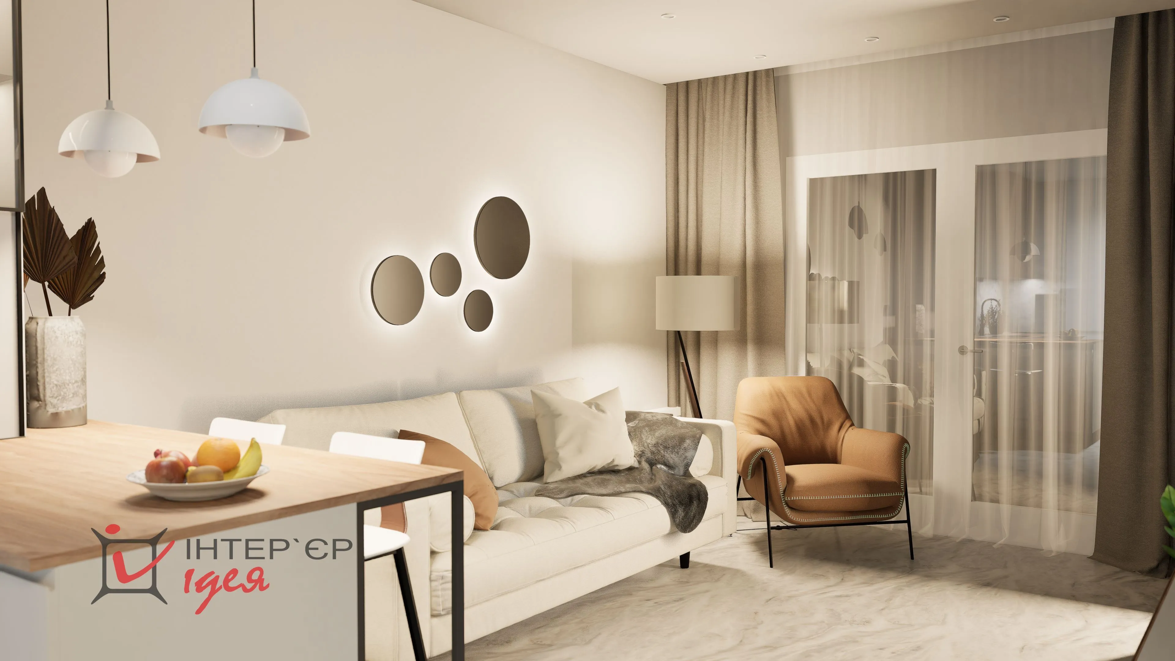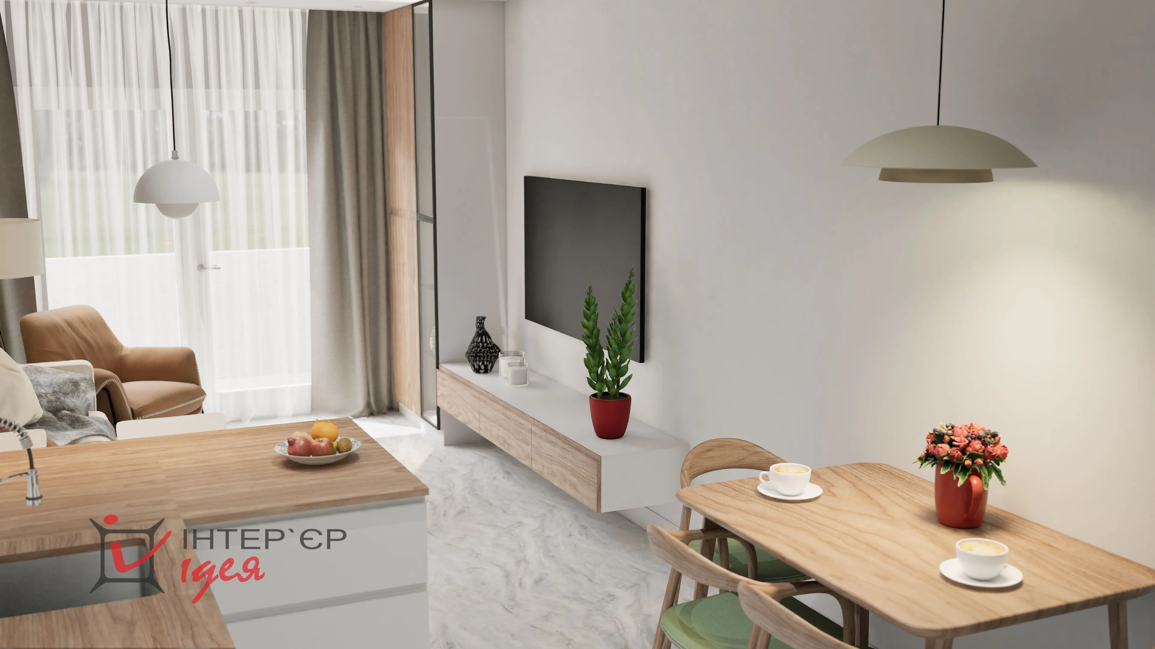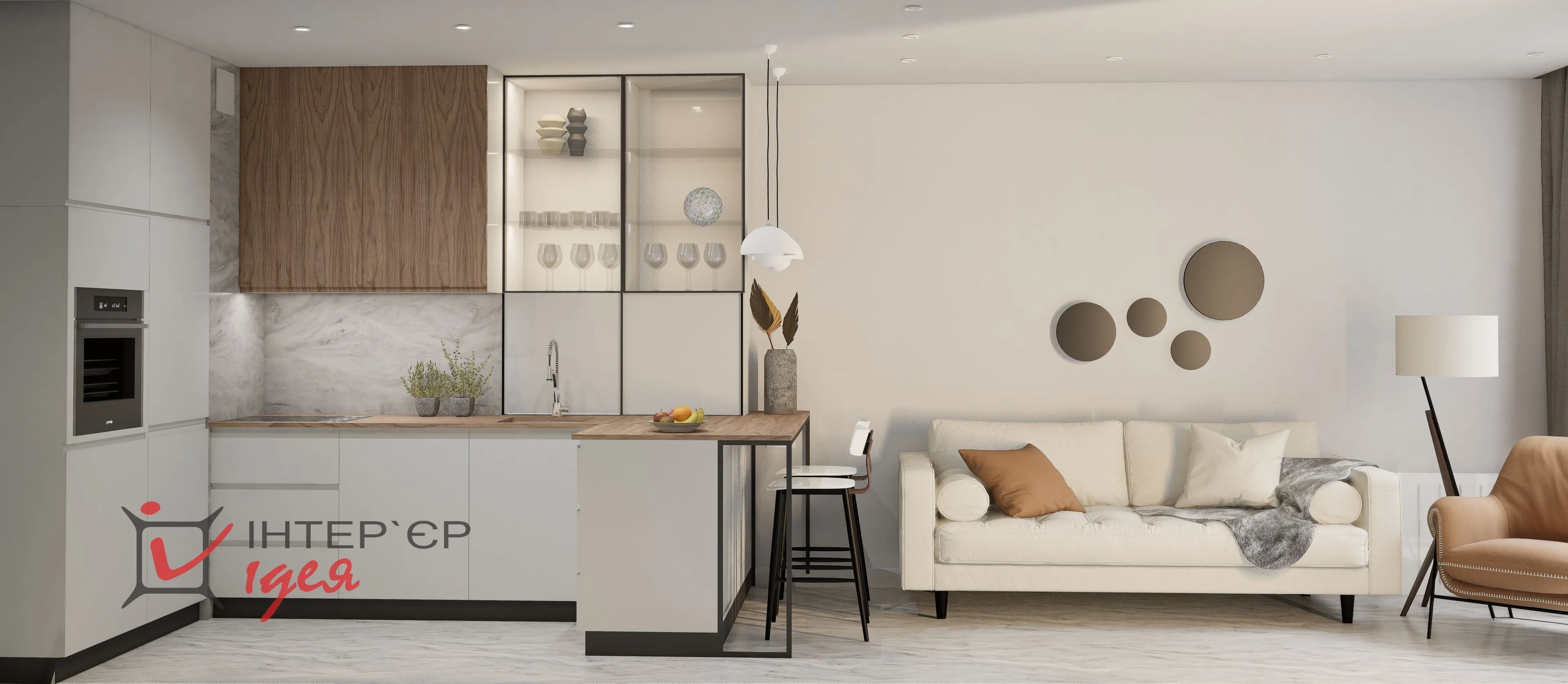 Мы объединили кухню с гостиной, что помогло получить светлое и открытое пространство для отдыха и времяпрепровождение всей семьей.