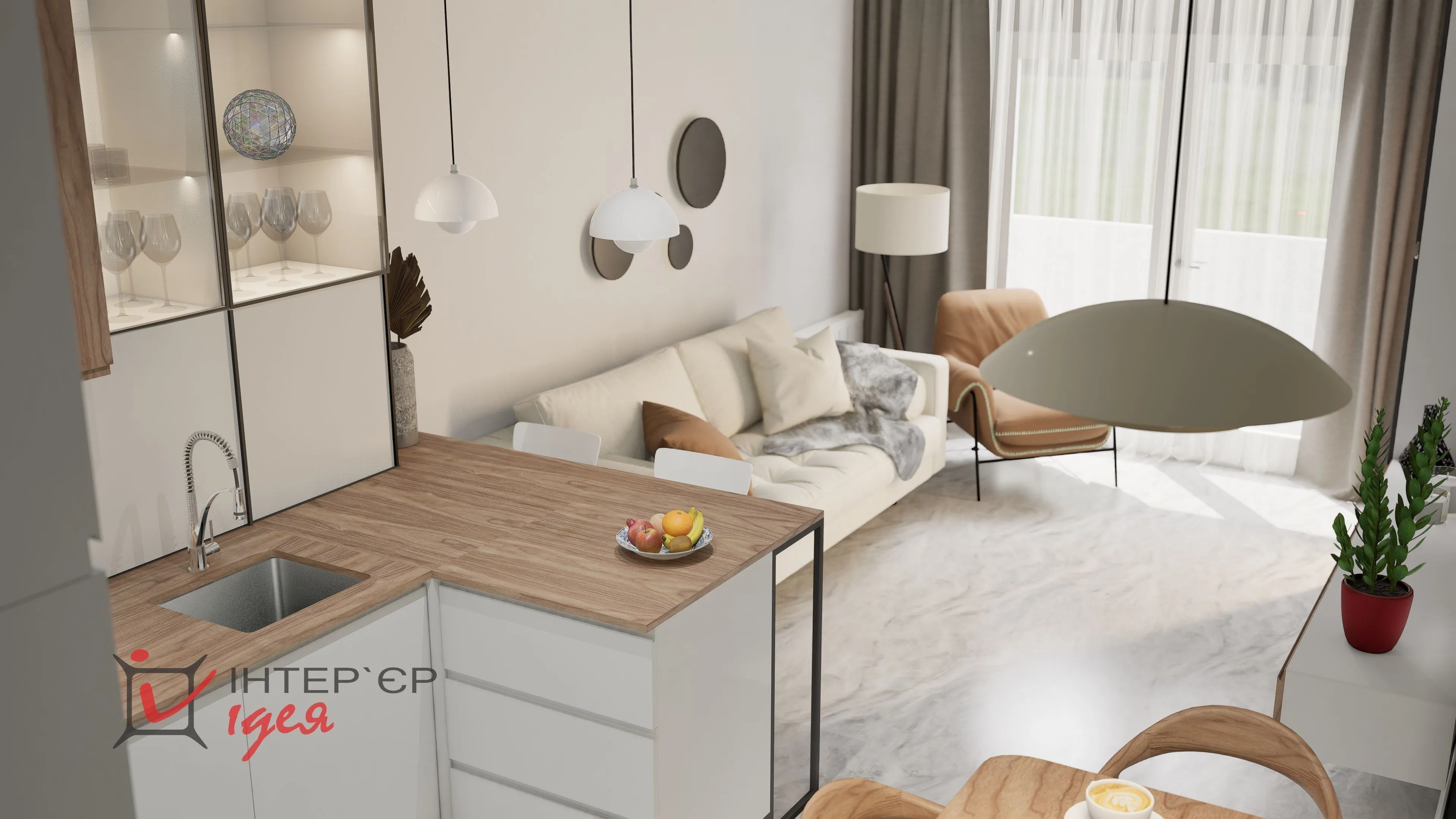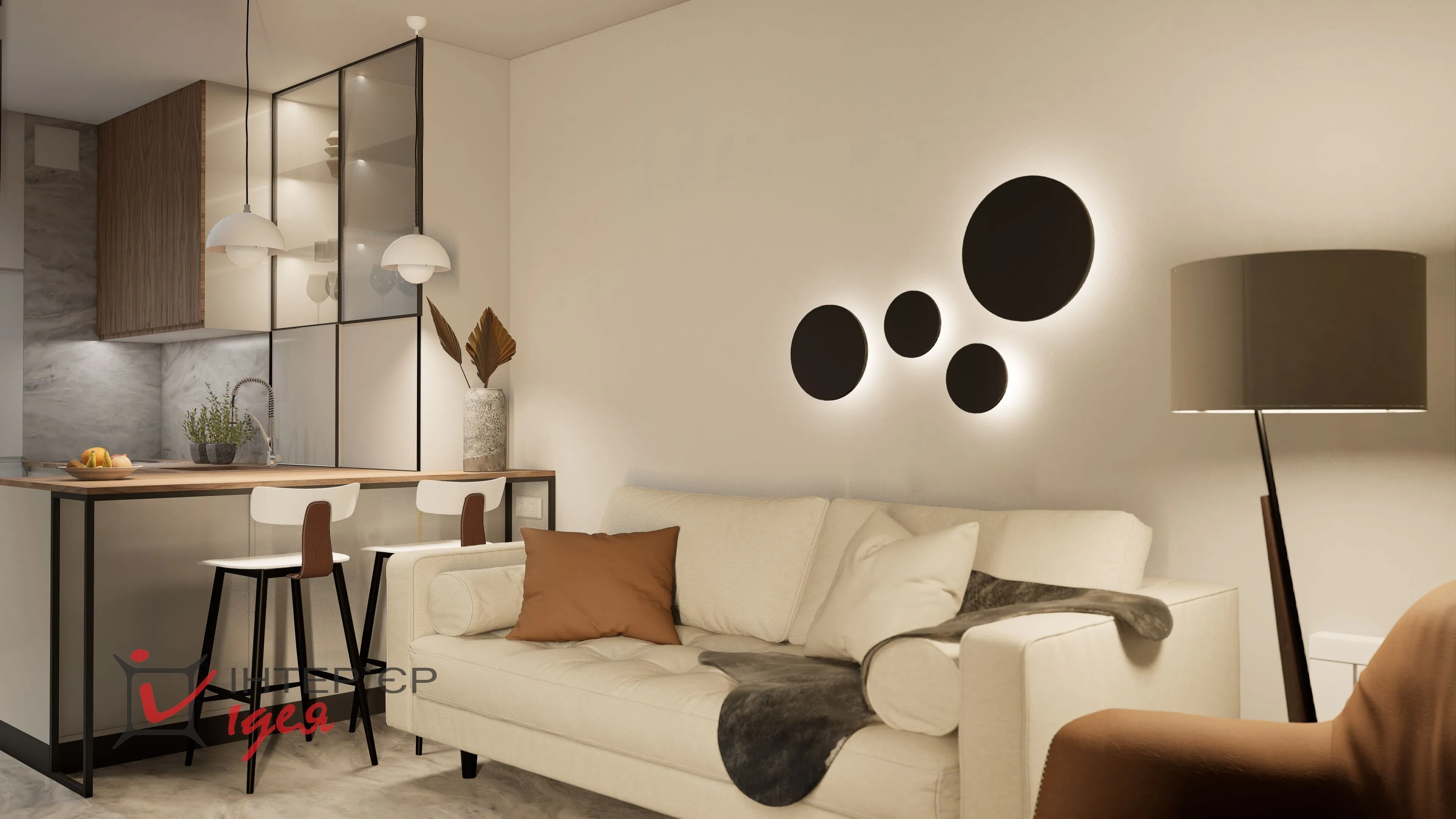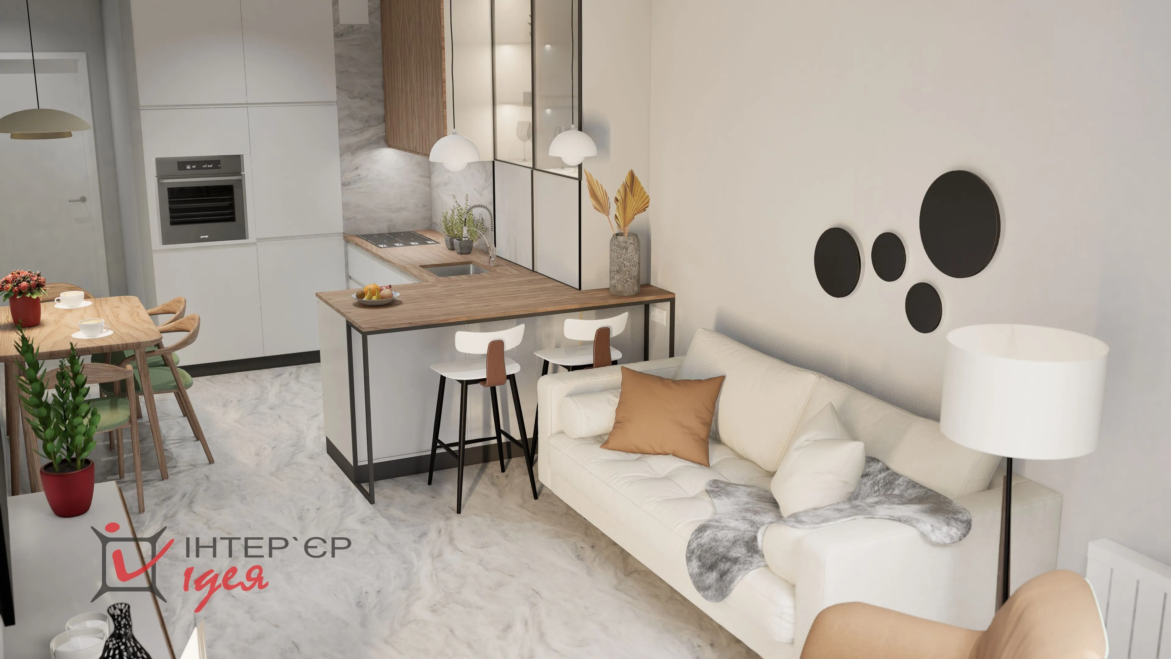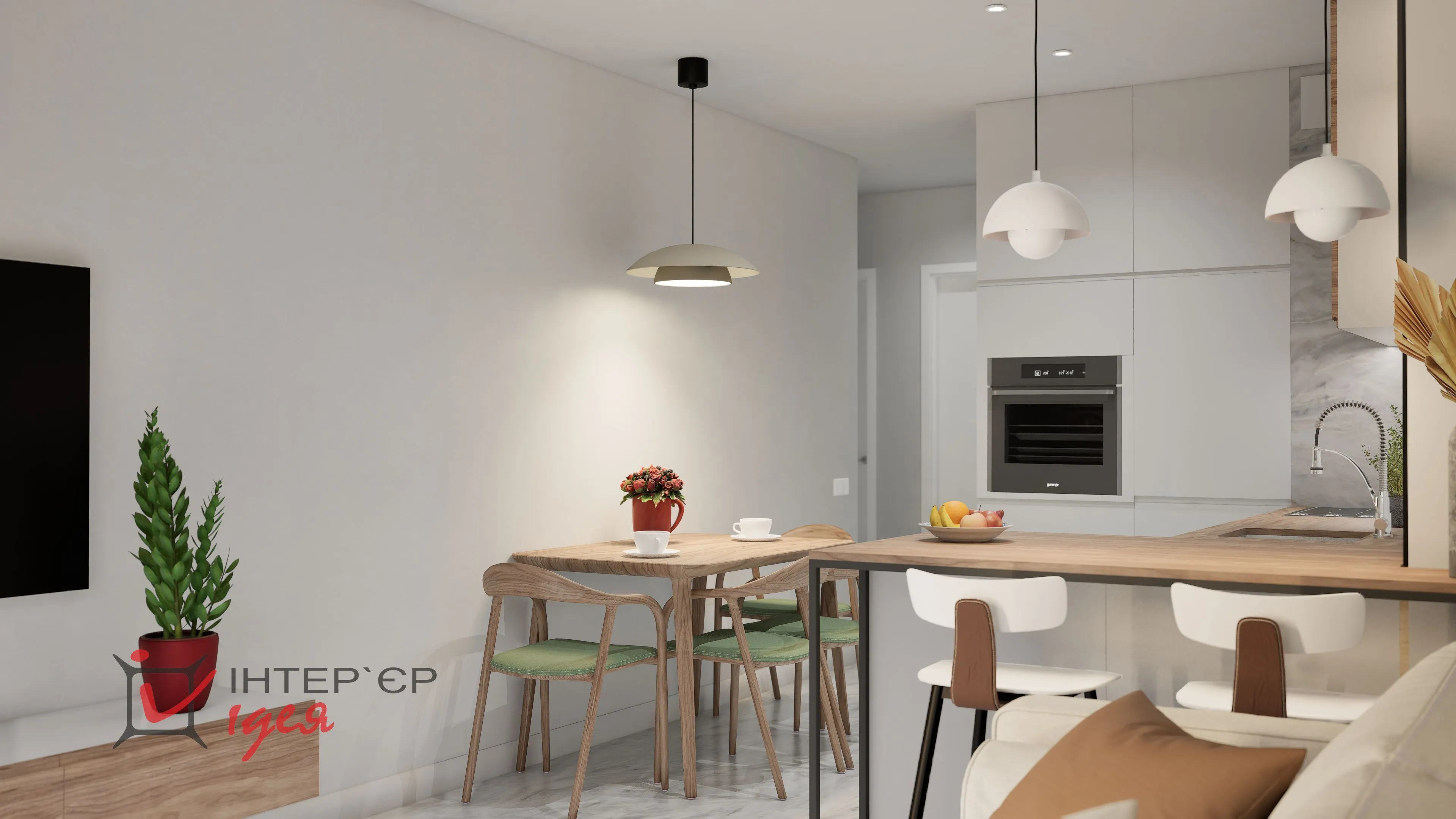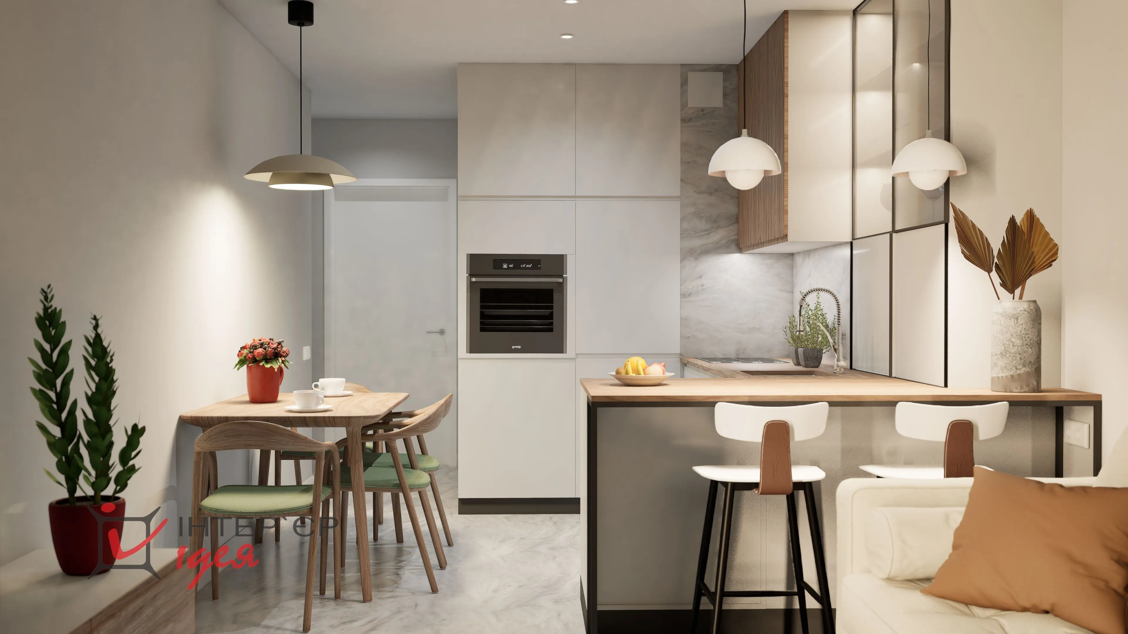 К кухонной поверхности между гостиной и кухней добавили полубарную стойку, чтобы удобно было утром завтракать, или выпить чашку ароматного кофе.