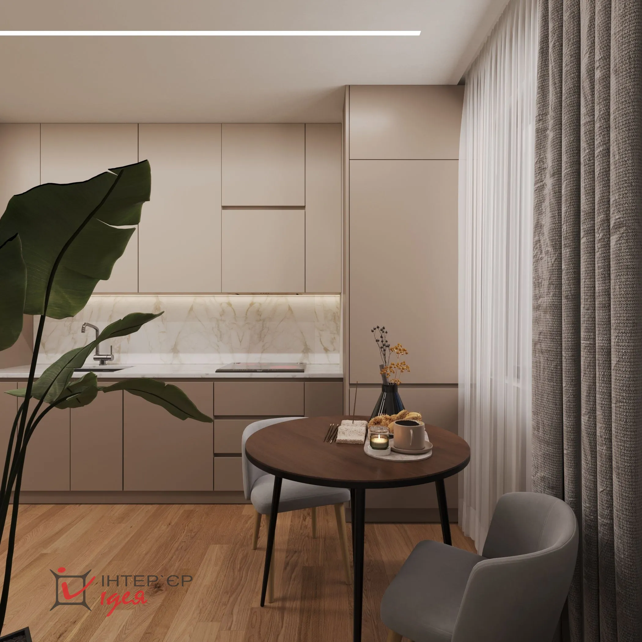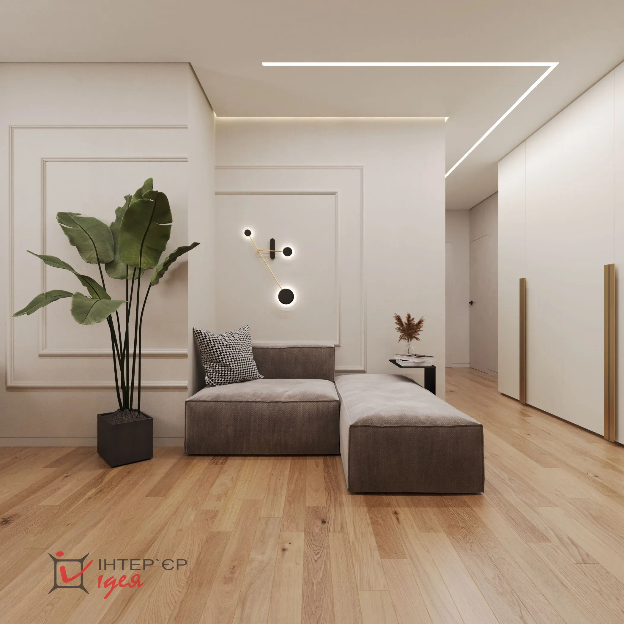 Это помещение выглядит очень светло и уютно. Стены окрашены в светло-бежевый цвет, что придает простору светлости и нежности. Мебель в светло-сером и бежевом цветах.