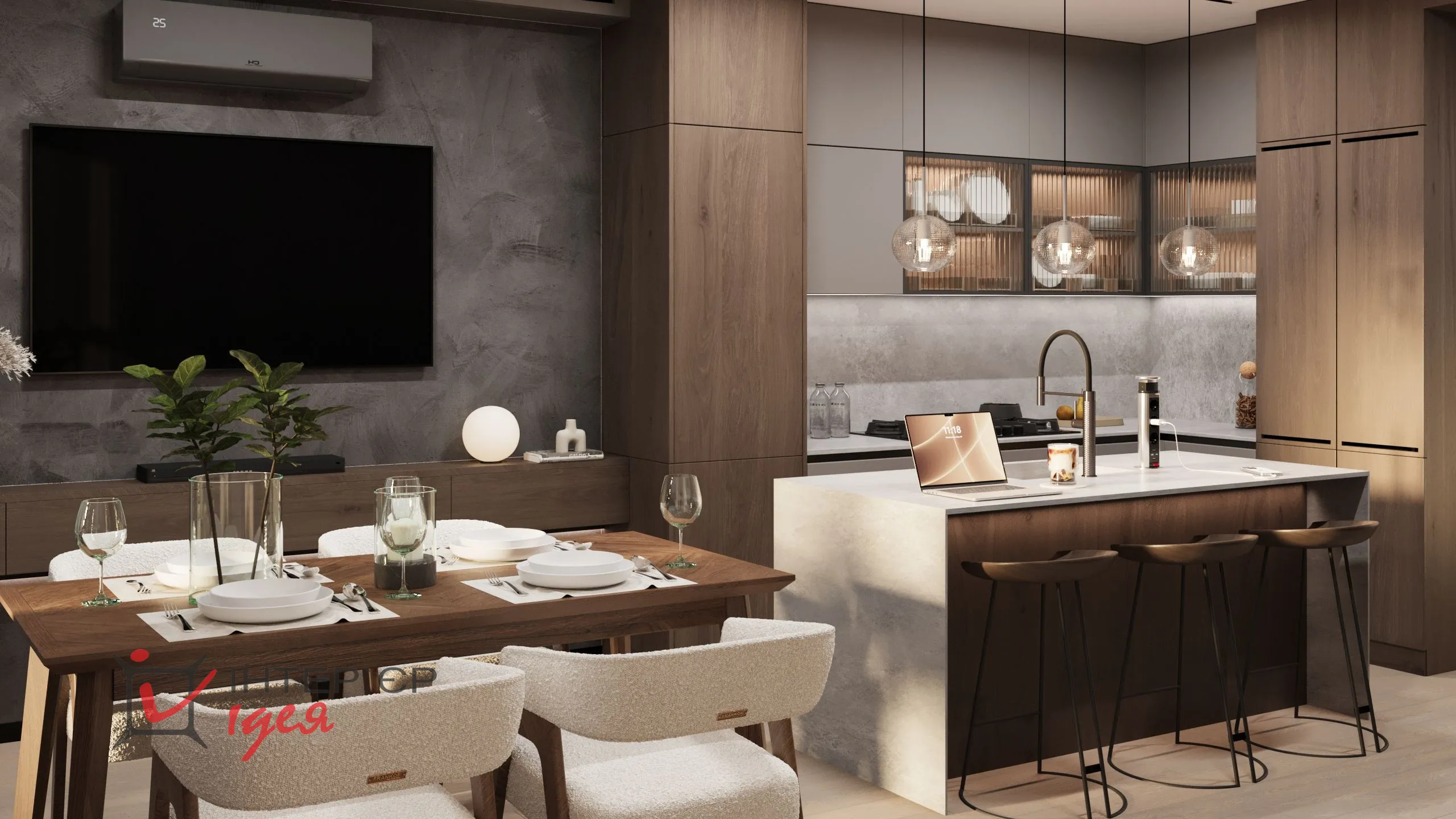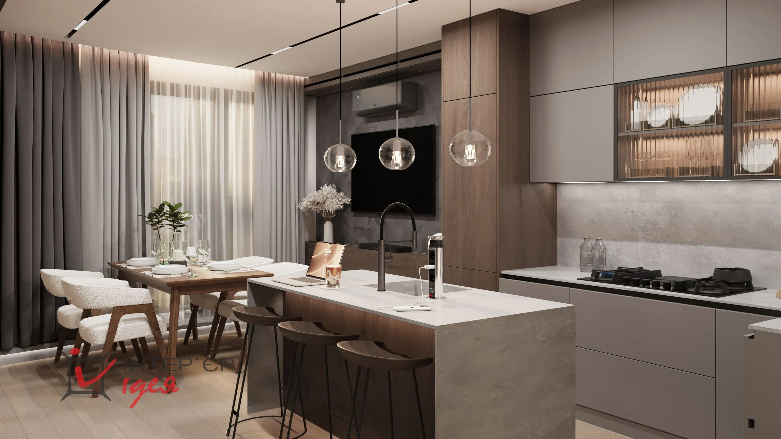 В центре комнаты находится кухонный остров с полубарной стойкой. Ближе к окну стоит большой и стильный стол для комфортного приема гостей. Также организована большая стеклянная раздвижная дверь в гостиную и достроенная лестница, ведущая на террасу.