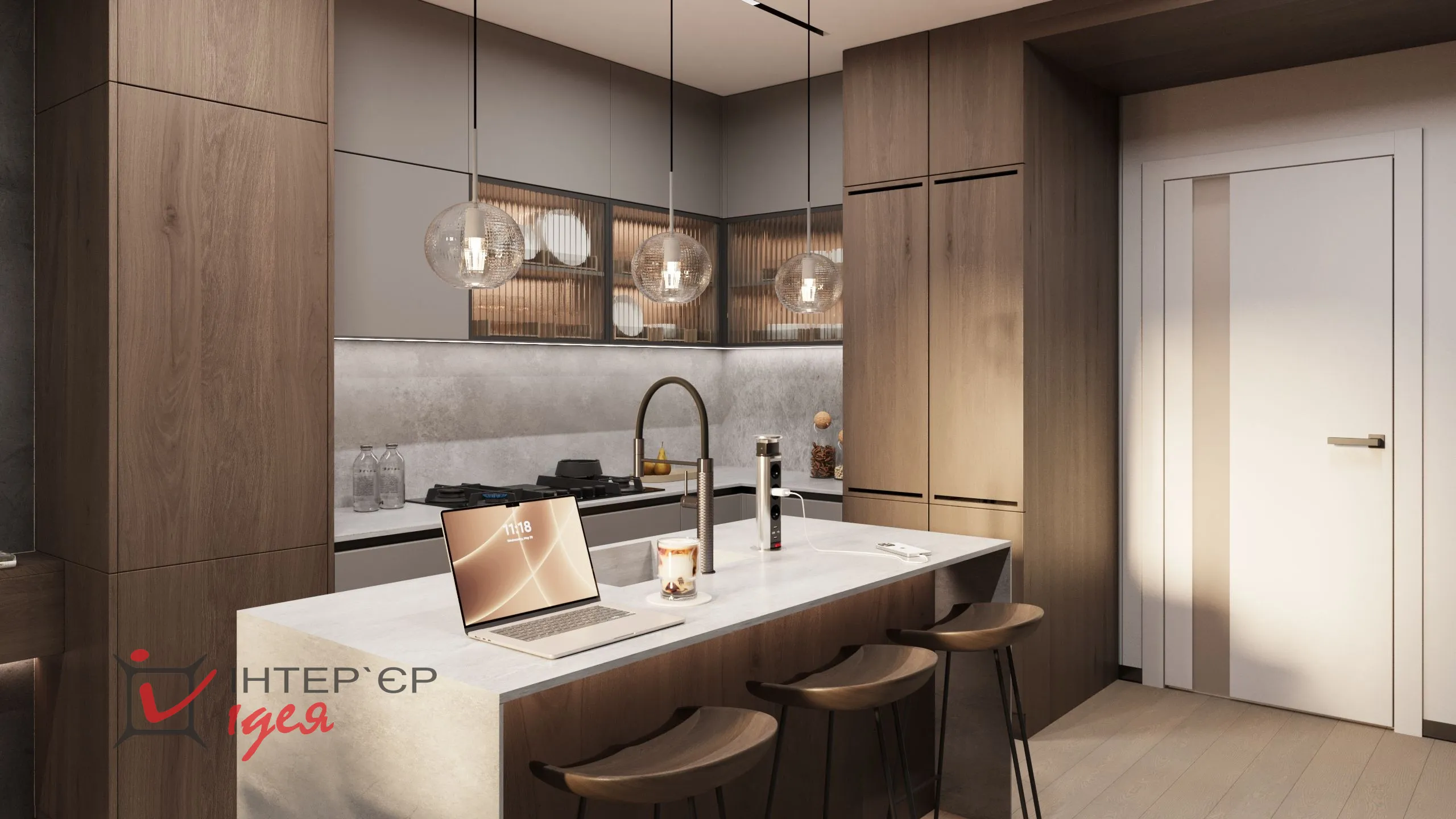 В этой комнате находится довольно большая кухня с интегрированной всей необходимой техникой, также скрыта в мебельных фасадах вентиляционная установка и газовый котел.