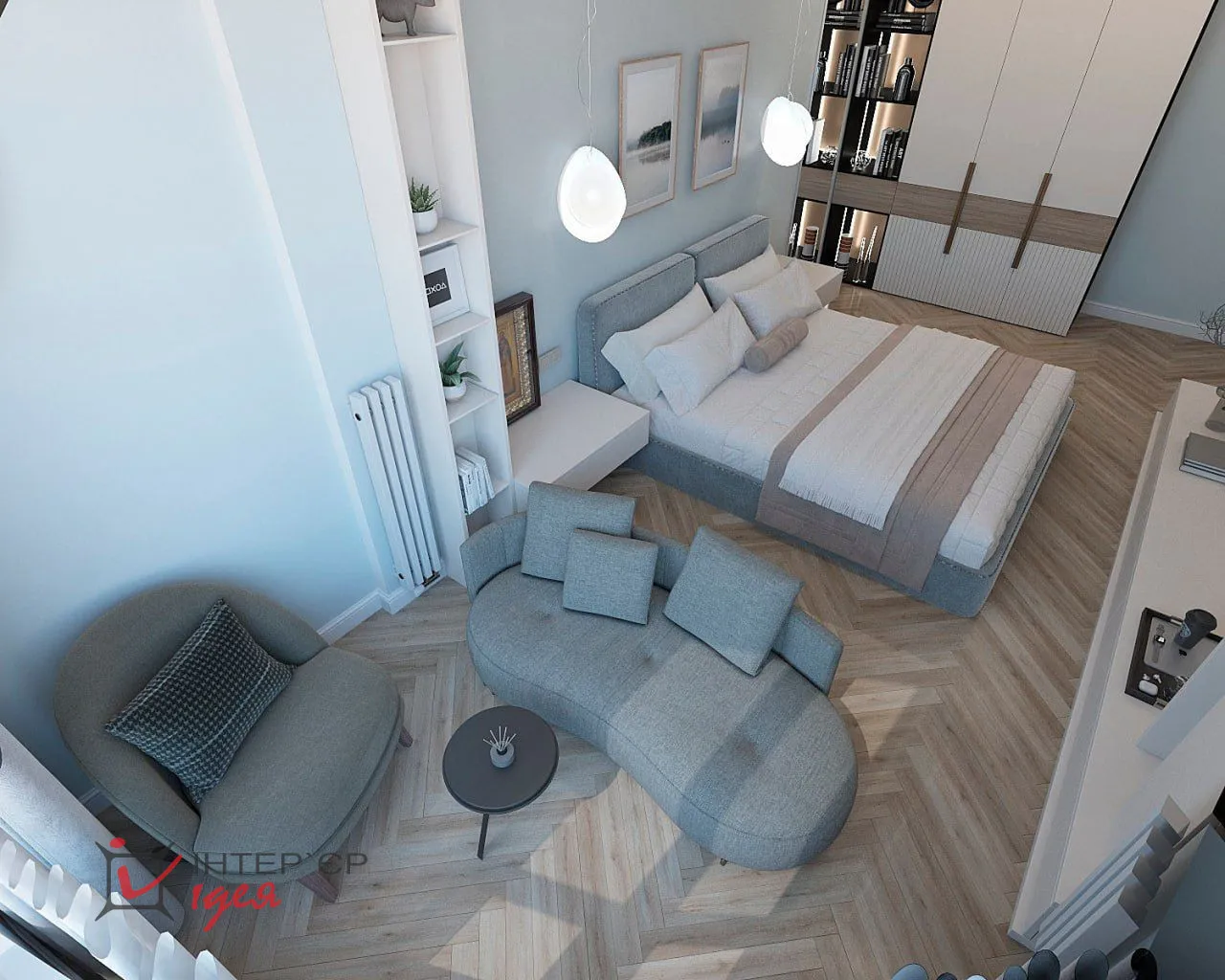 В центре комнаты расположена удобная двуспальная кровать, обеспечивающая комфортный отдых. Рядом предусмотрено место для шкафа, но главным акцентом пространства становится уютный мягкий уголок с журнальным столиком - идеальное место для неспешных бесед, утреннего кофе или вечерних раздумий под волшебный пейзаж на море.