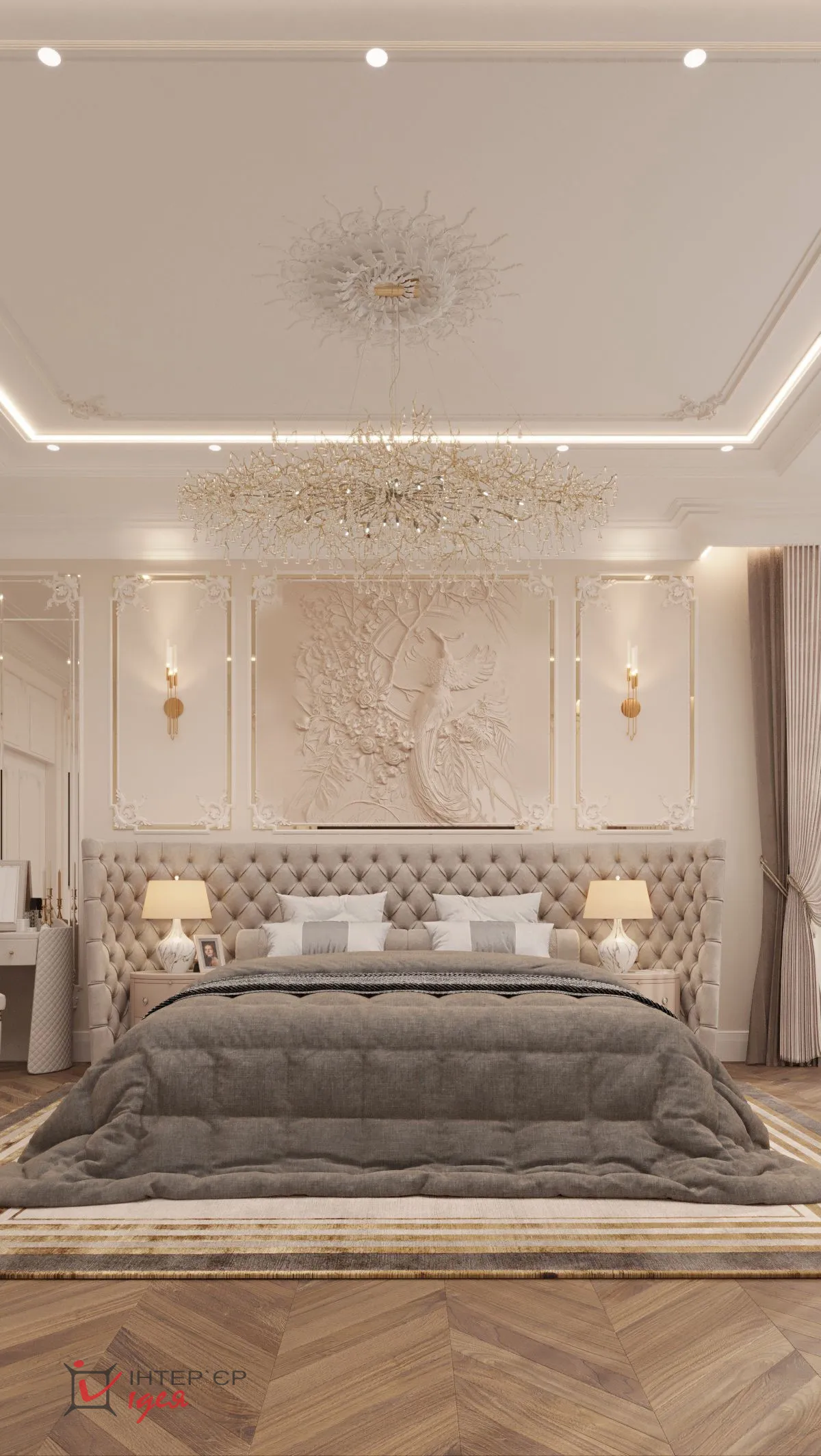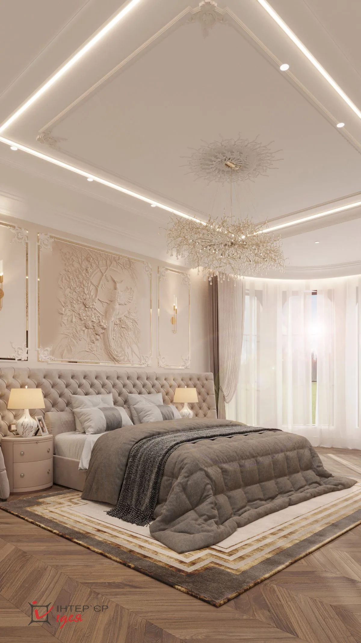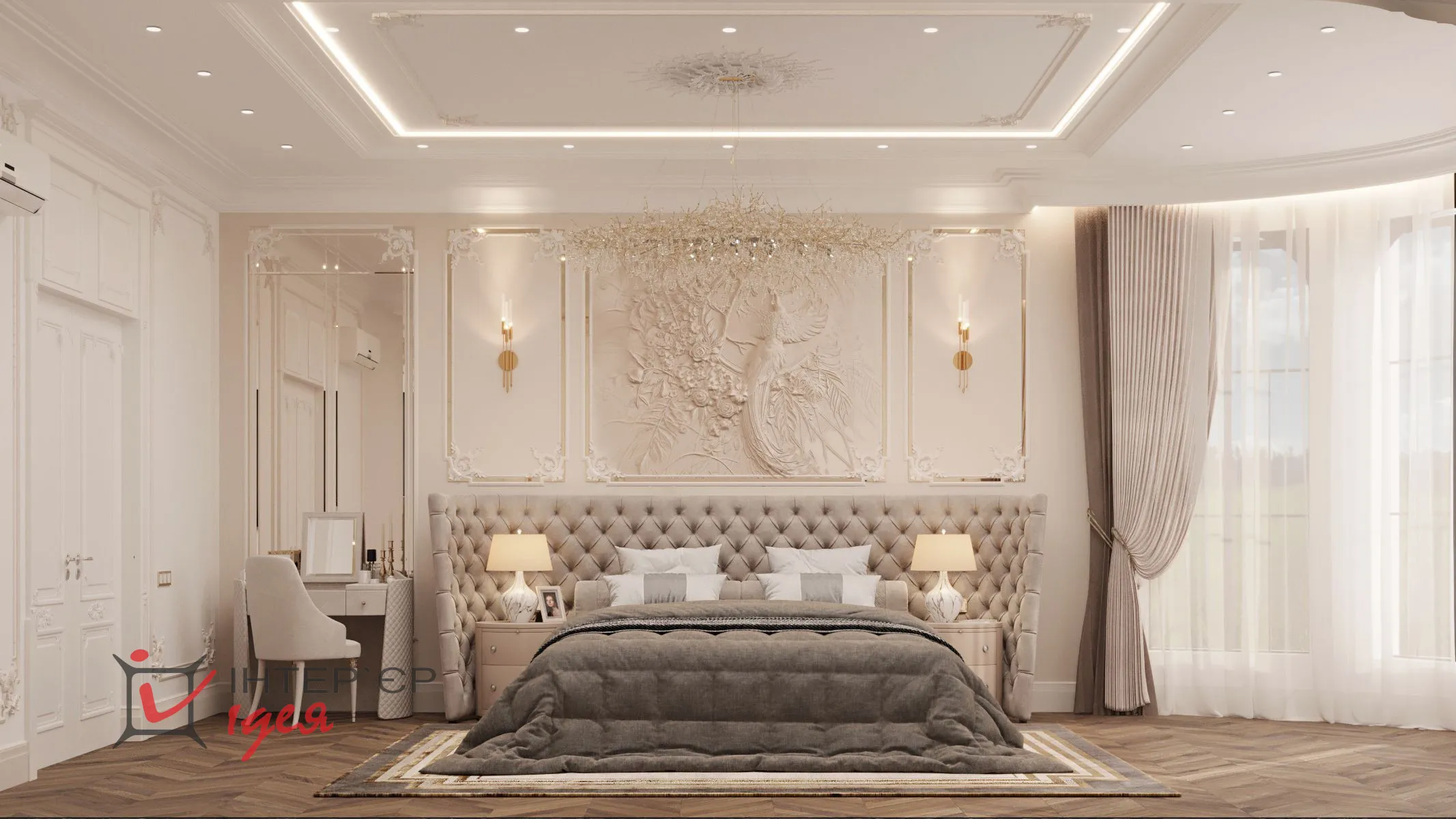 Стены спальни украшены светлыми, пастельными тонами, что визуально расширяет пространство и создает ощущение легкости и воздушности. Над кроватью расположено большое декоративное панно с оригинальной лепниной, которое придает интерьеру изысканность и индивидуальность.