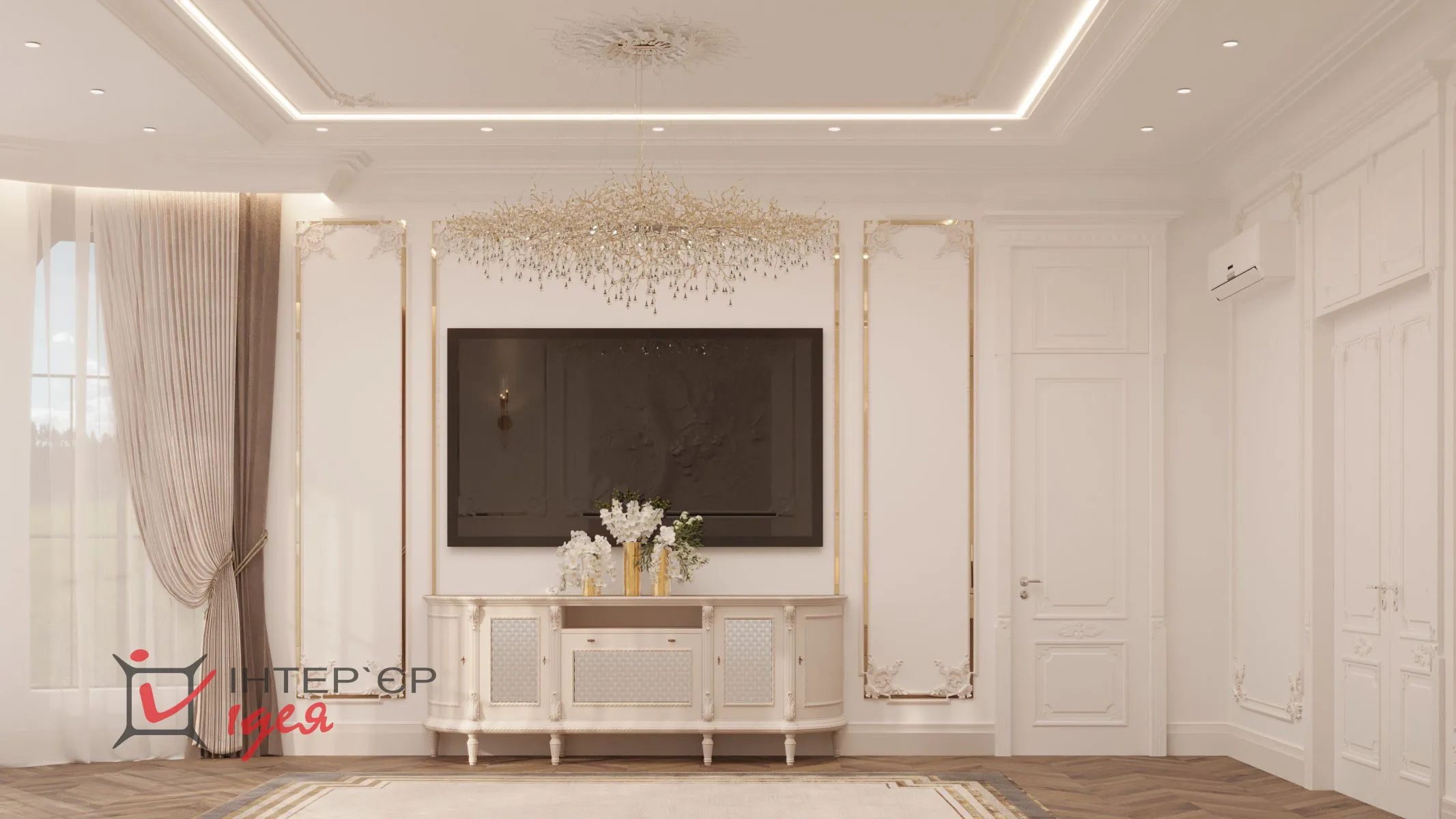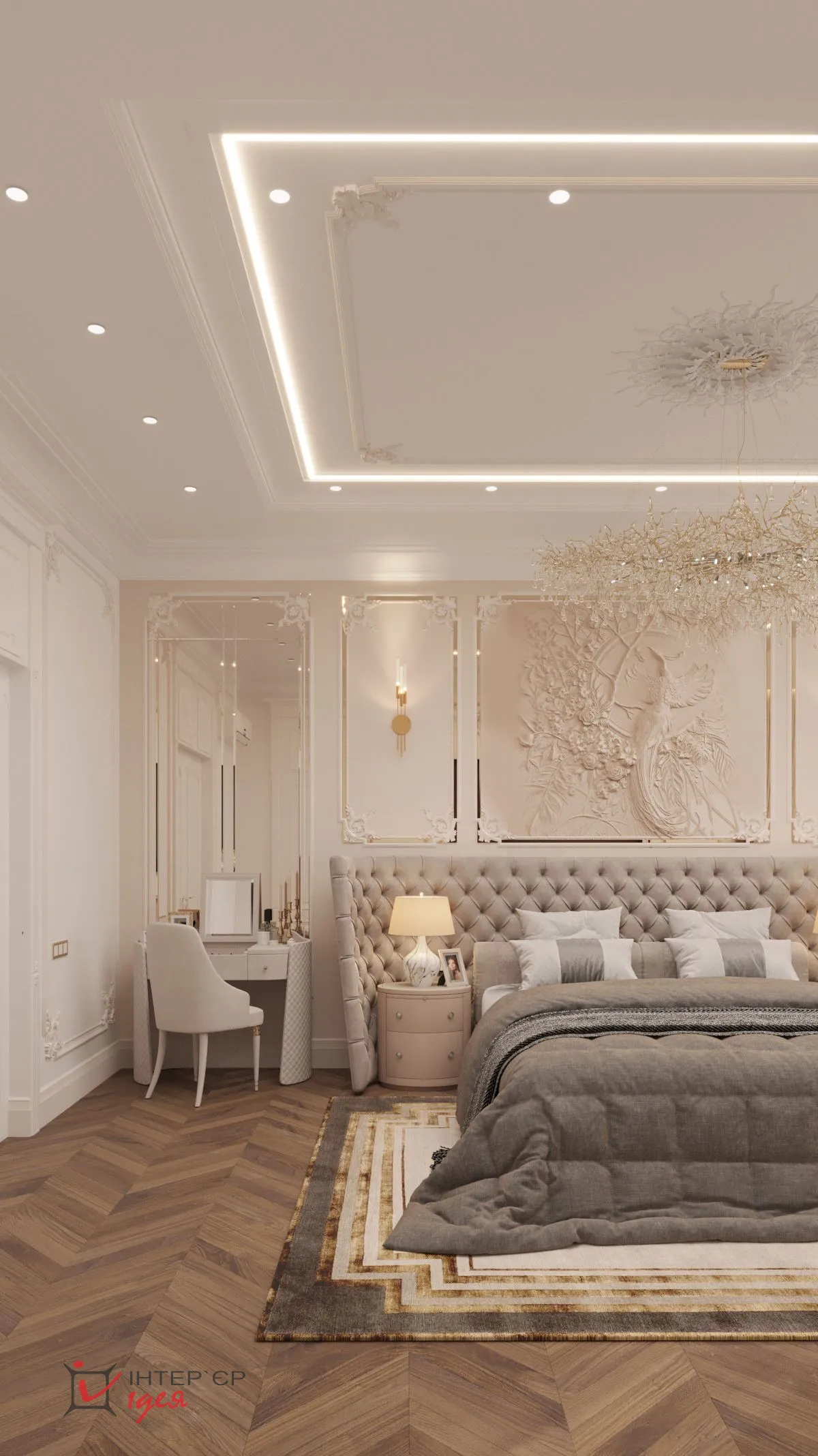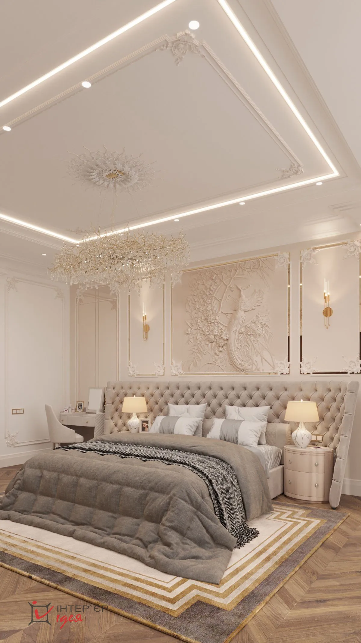 Стены спальни украшены светлыми, пастельными тонами, что визуально расширяет пространство и создает ощущение легкости и воздушности. Над кроватью расположено большое декоративное панно с оригинальной лепниной, которое придает интерьеру изысканность и индивидуальность.