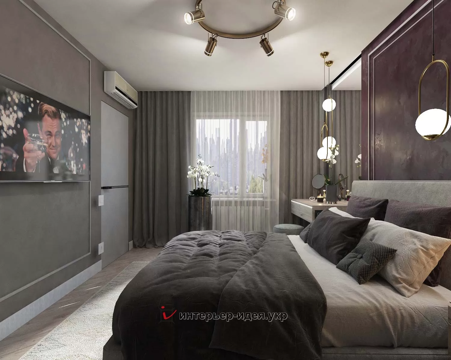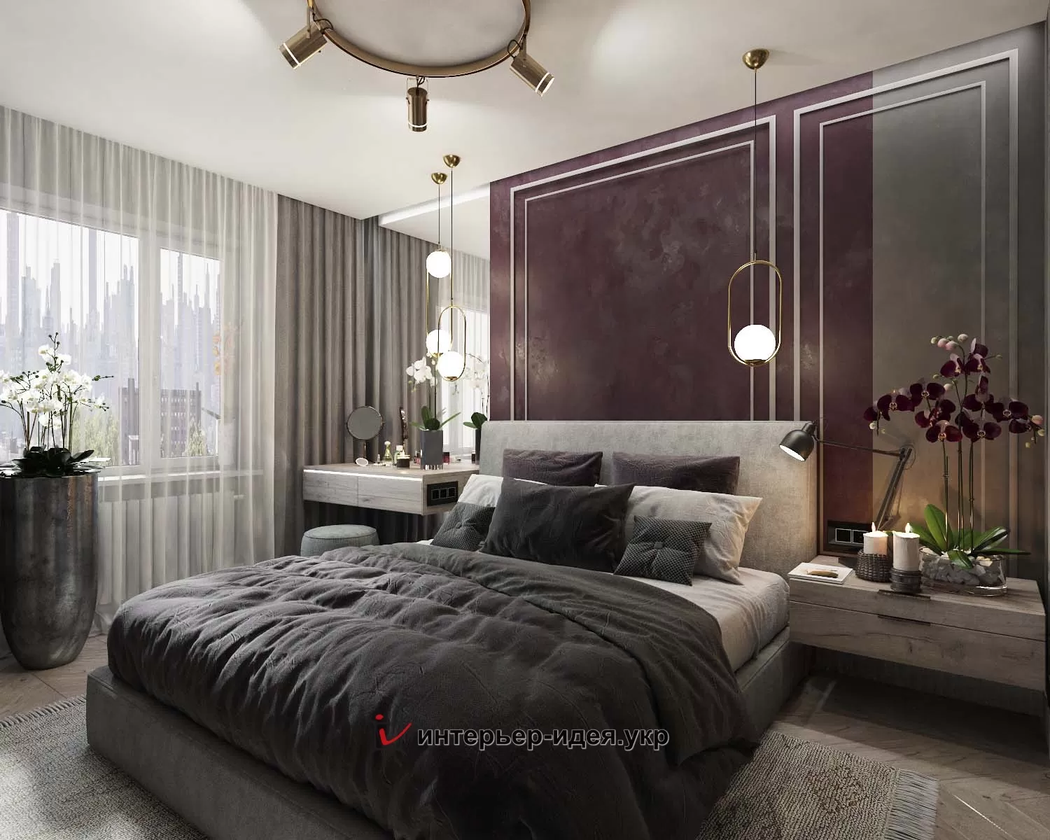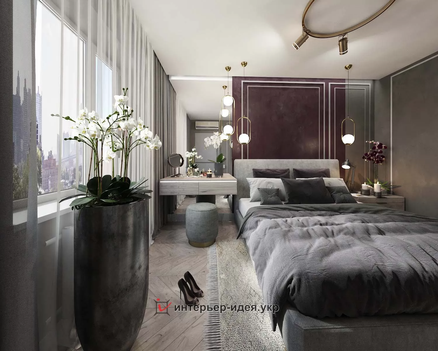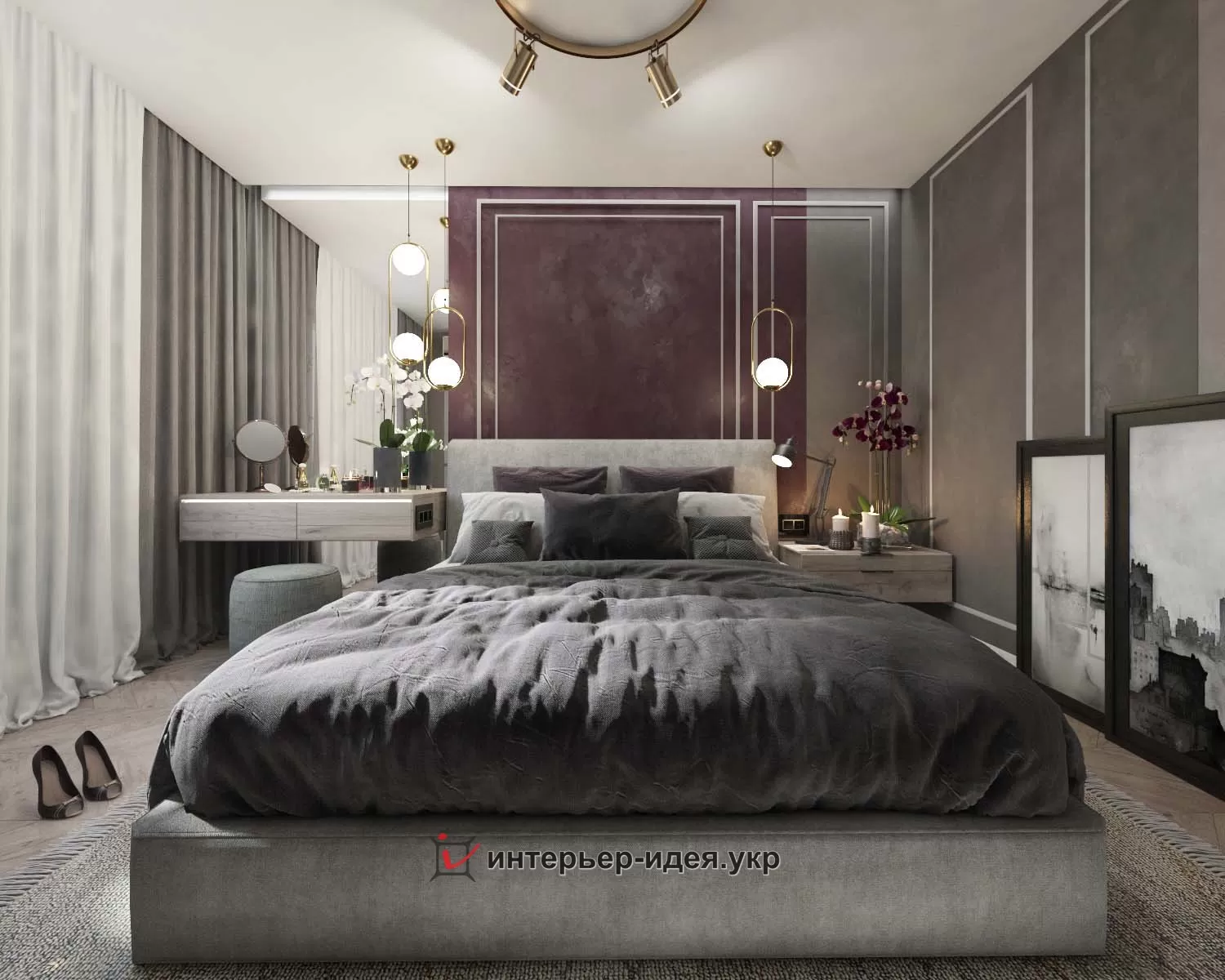 На стенах декоративная штукатурка, основной акцентный цвет - вишневый (любимый цвет заказчицы) и дополнительный тон графитовый, остальные стены окрашены в светло-серый тон.