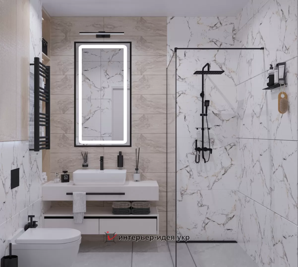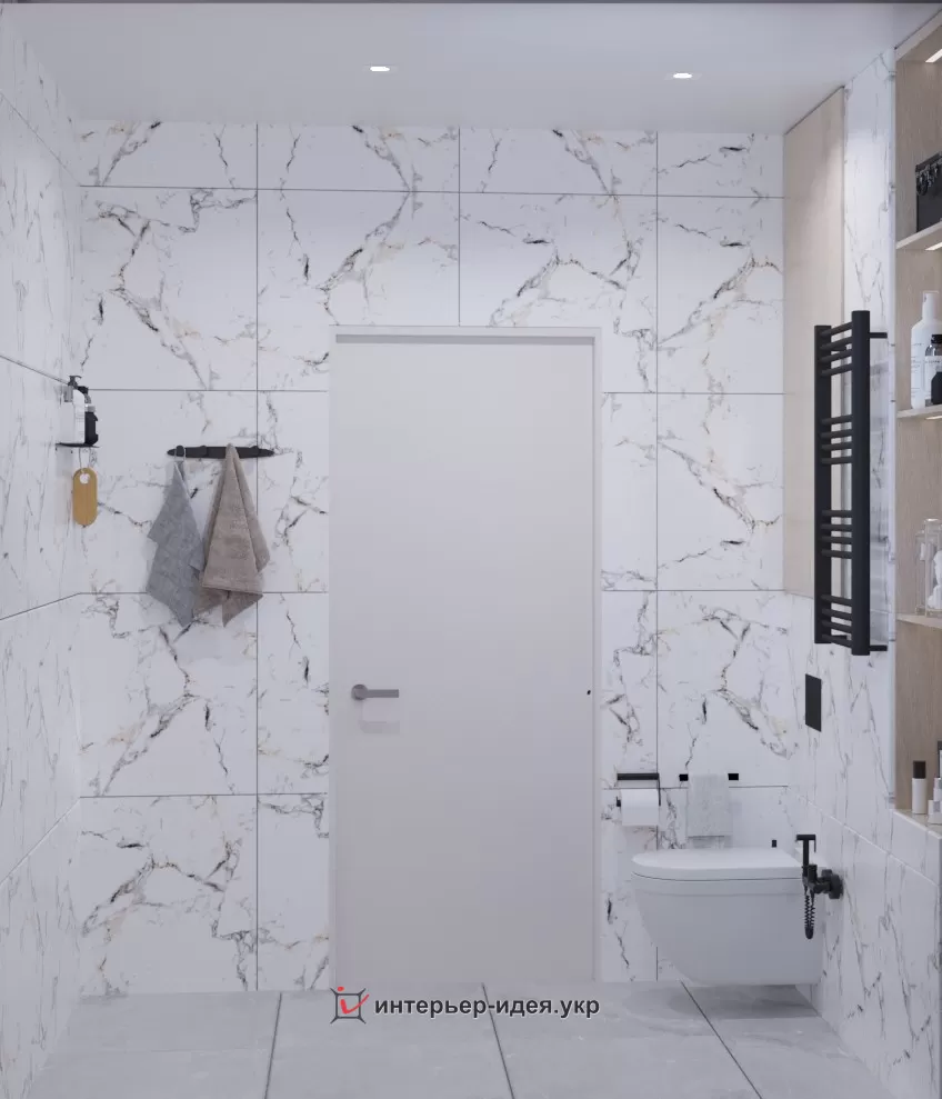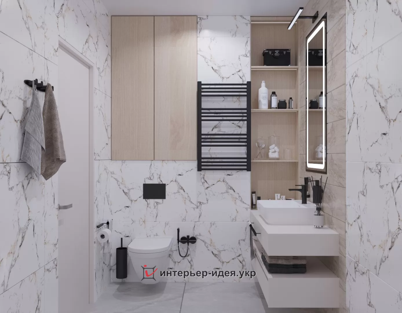 Над инсталляцией для подвесного унитаза расположен шкаф для хранения моющих средств и других предметов обихода. Рядом – полотенцесушитель и открытые полки с подсветкой, которые удобно расположены возле столешницы с умывальником.