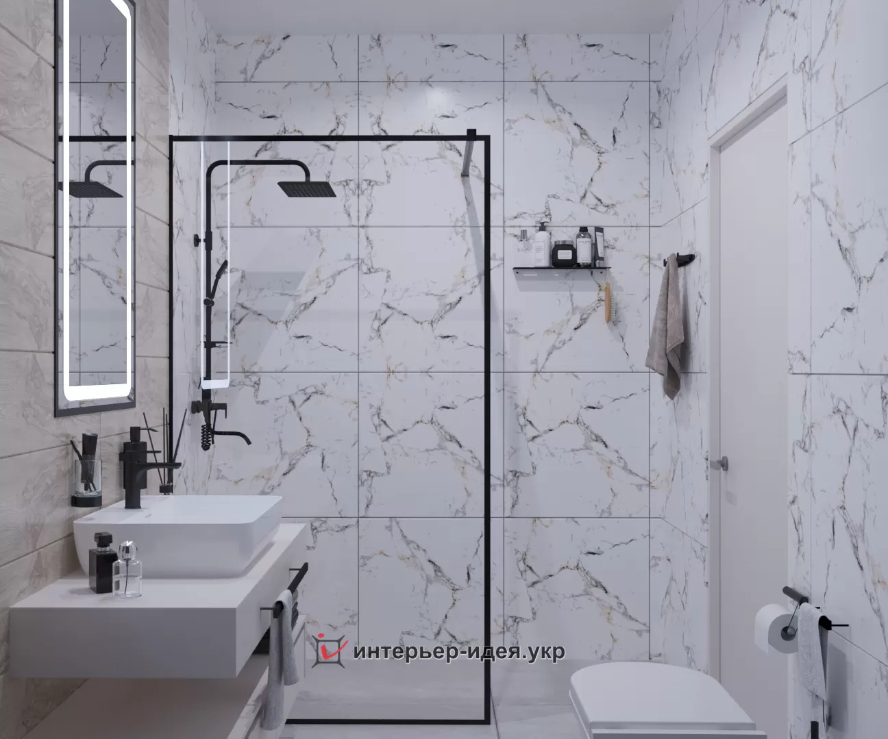 Черные детали в виде смесителей, аксессуаров, держателей для полотенец, обрамления зеркала и душевой перегородки придают интерьеру четкости и лаконичности.