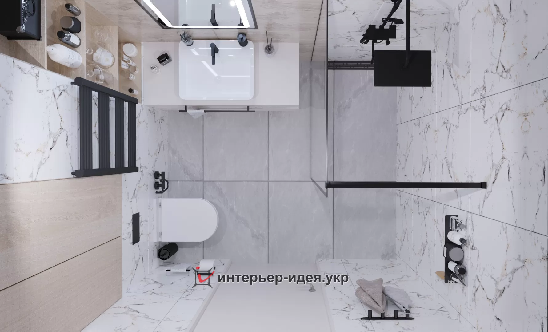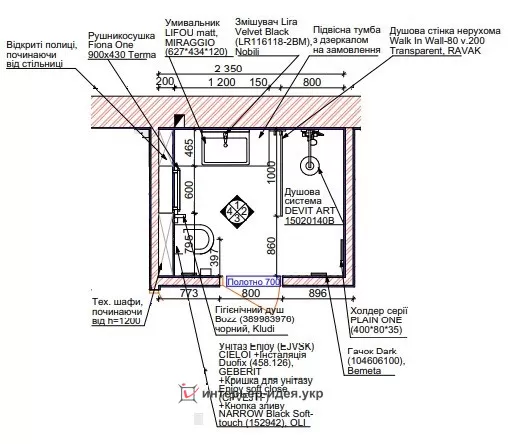 Согласно техническому заданию в санузле необходимо было разместить унитаз, умывальник с зеркалом, душевую кабину и полотенцесушитель.