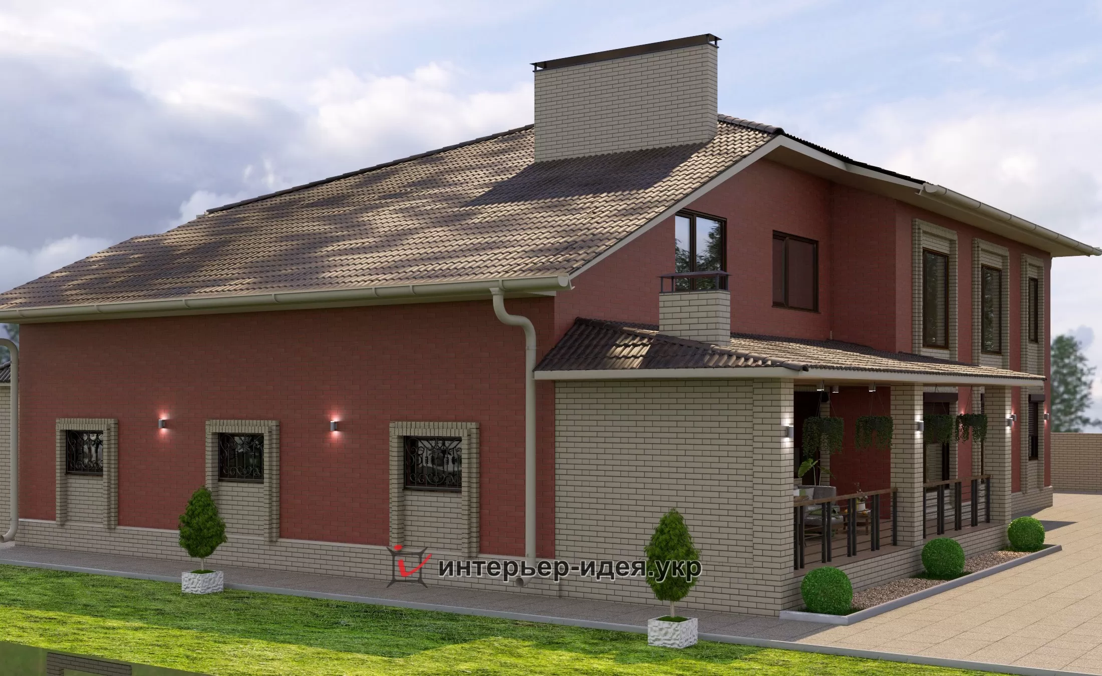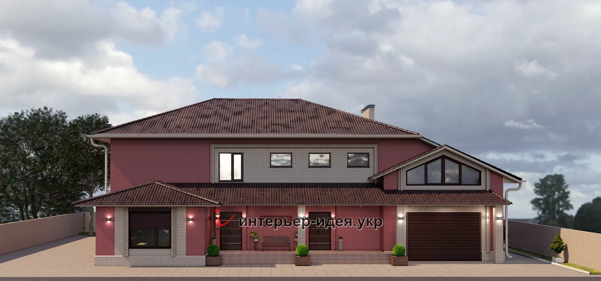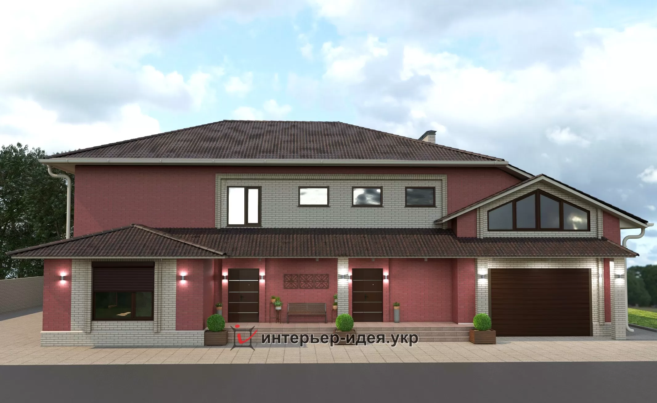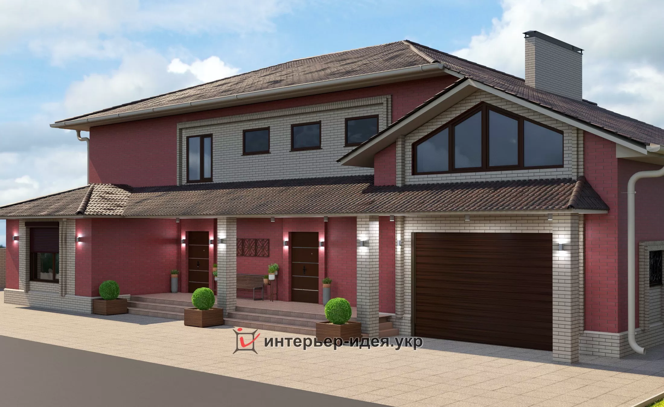 Так как дом большой, большую часть кирпича выбрали темную - бордо, визуально уменьшает объем, и разбавили его выделив светлыми вставками вокруг окон.