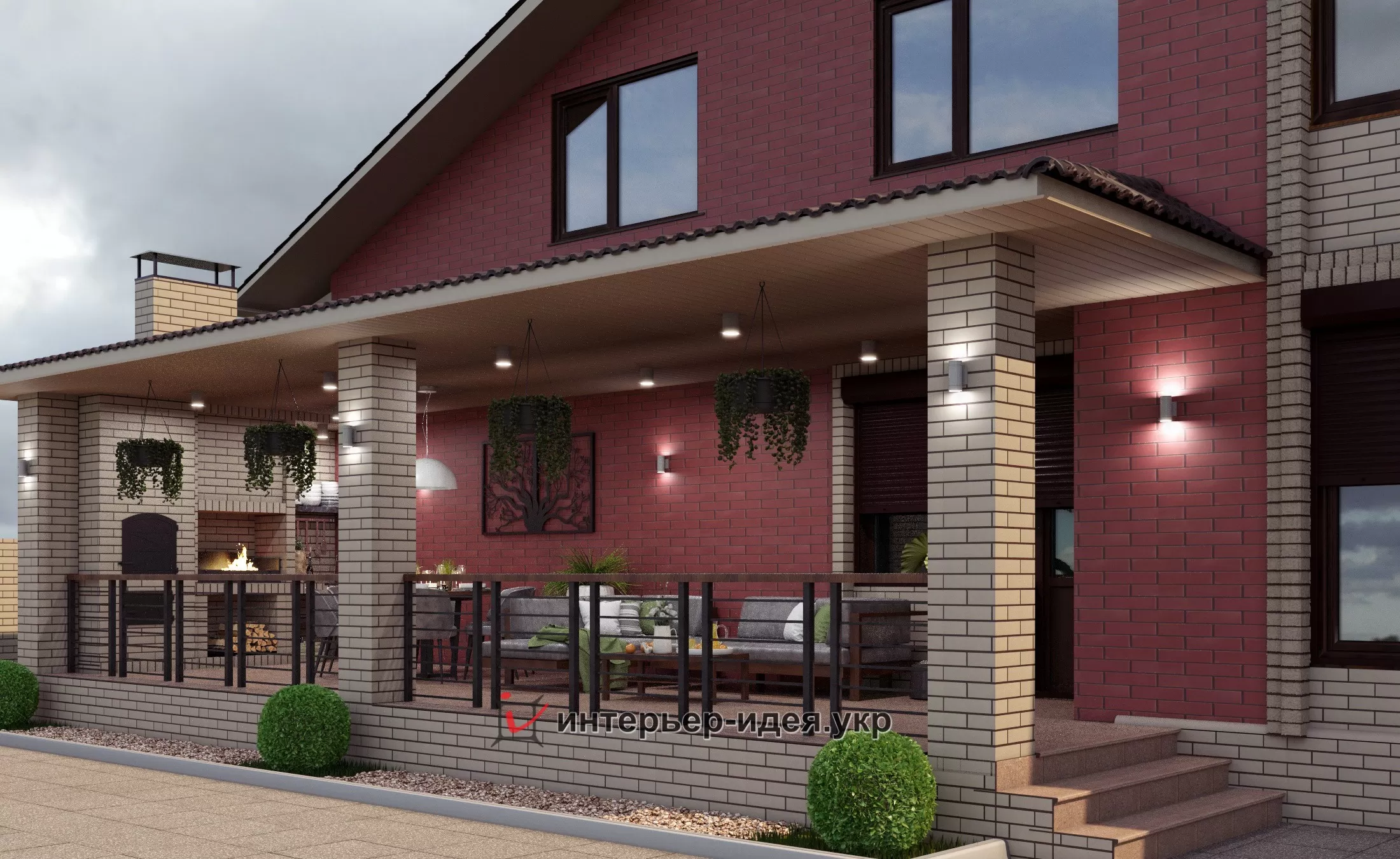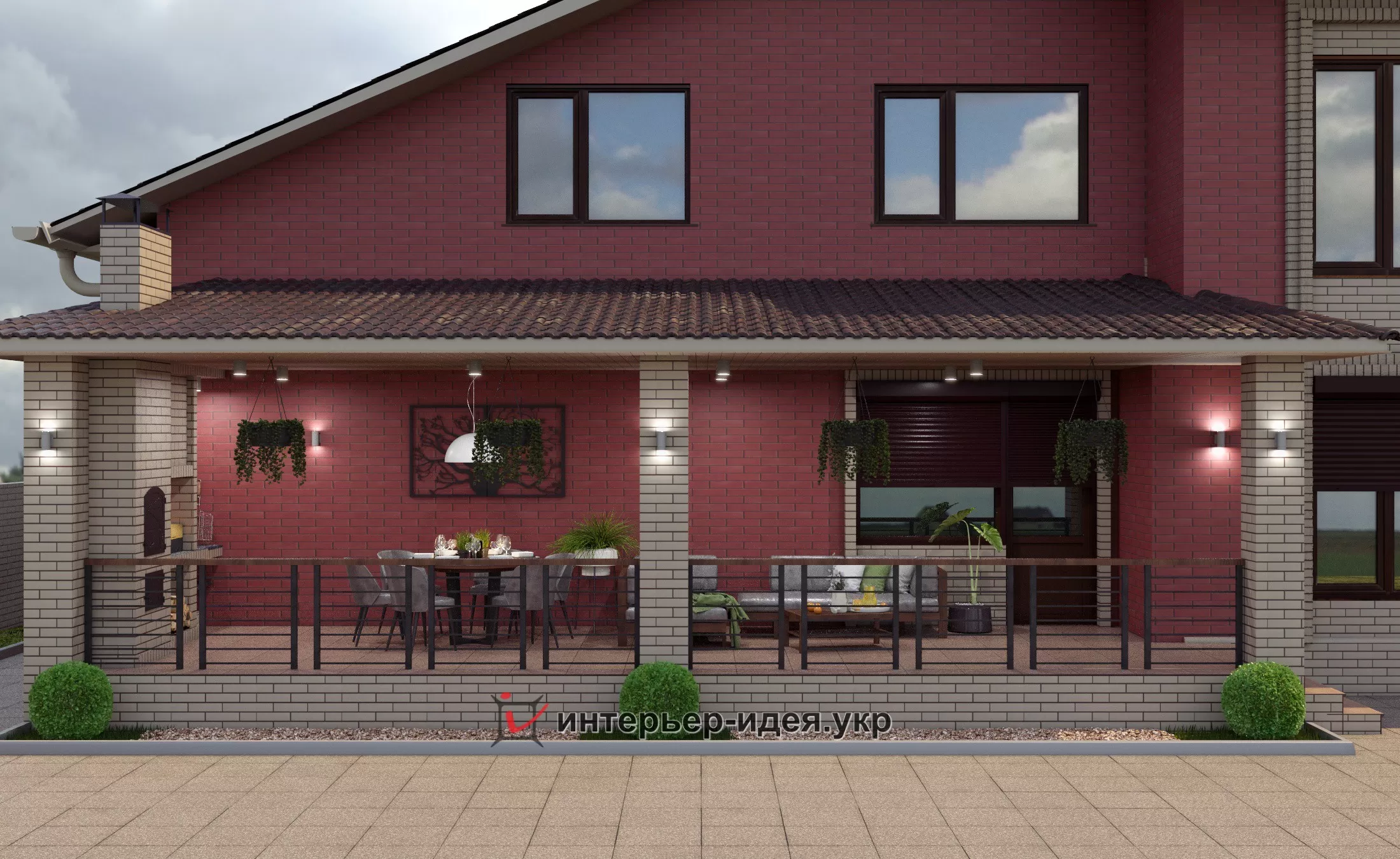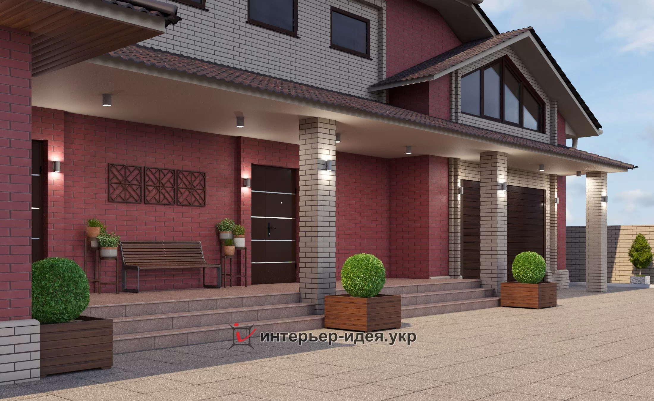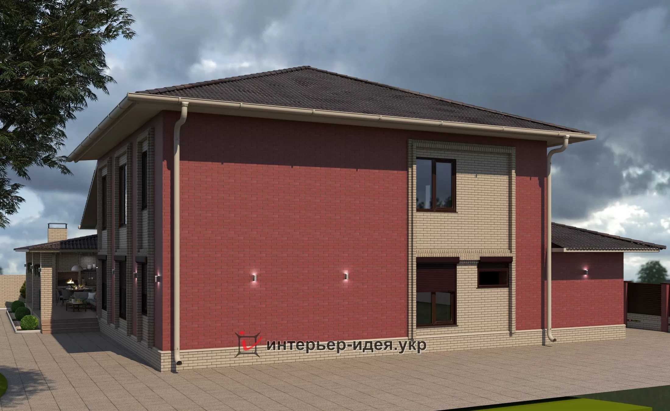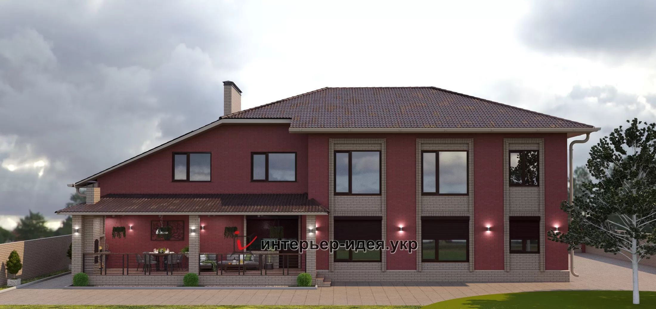 Так как дом большой, большую часть кирпича выбрали темную - бордо, визуально уменьшает объем, и разбавили его выделив светлыми вставками вокруг окон.