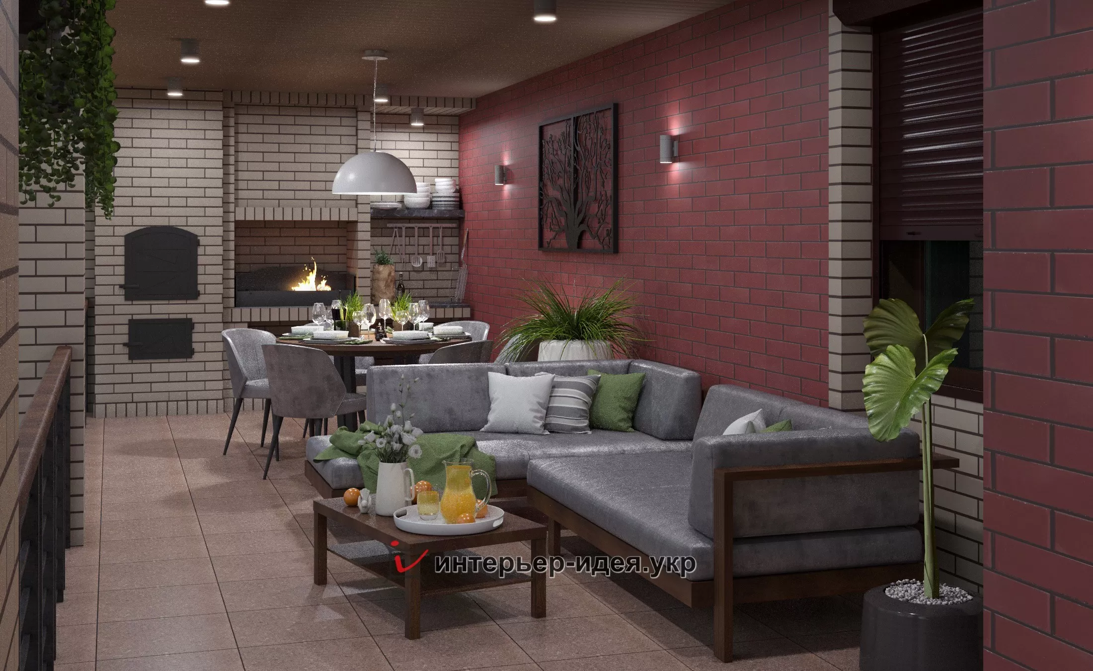 На заднем дворе размещена терраса с зоной барбекю, большим круглым столом и мягкими диванчиками для отдыха теплыми вечерами с семьей и друзьями.