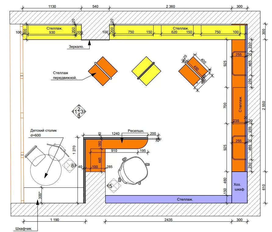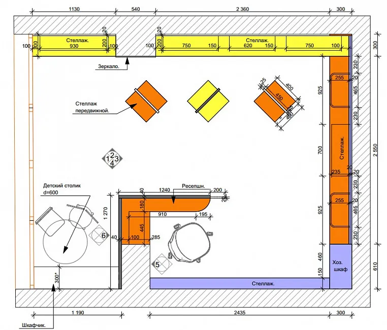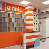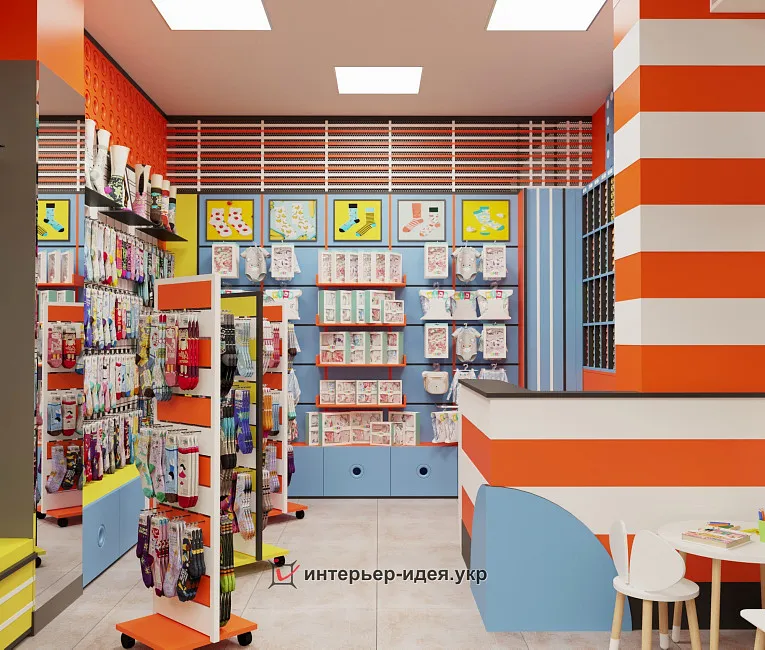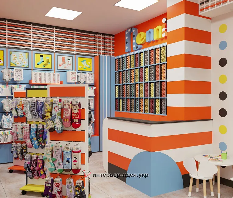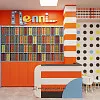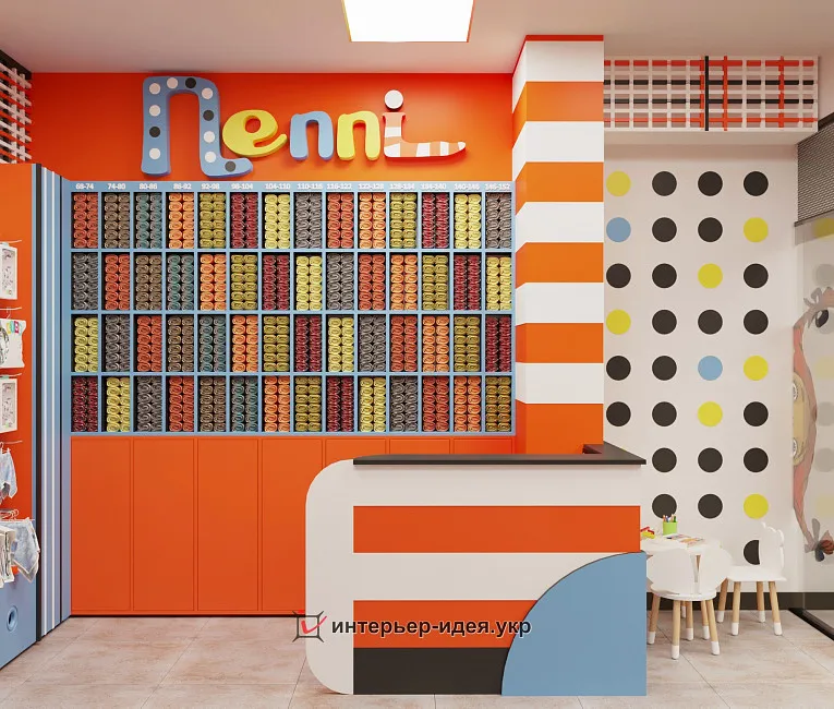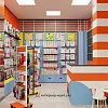 Яркие цвета, разные геометрические формы в оформлении стен и стеллажей.