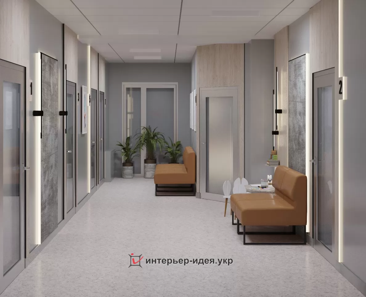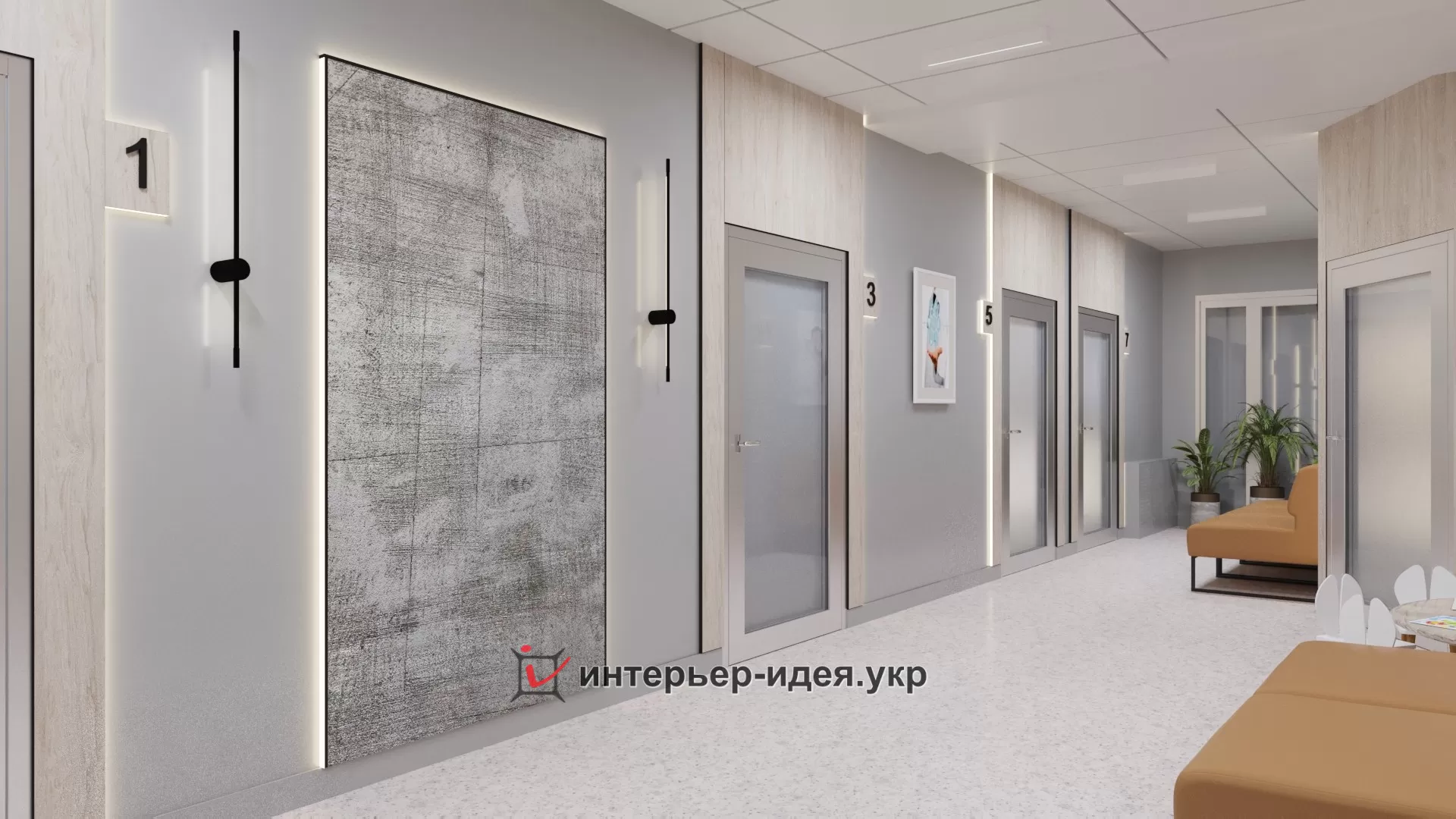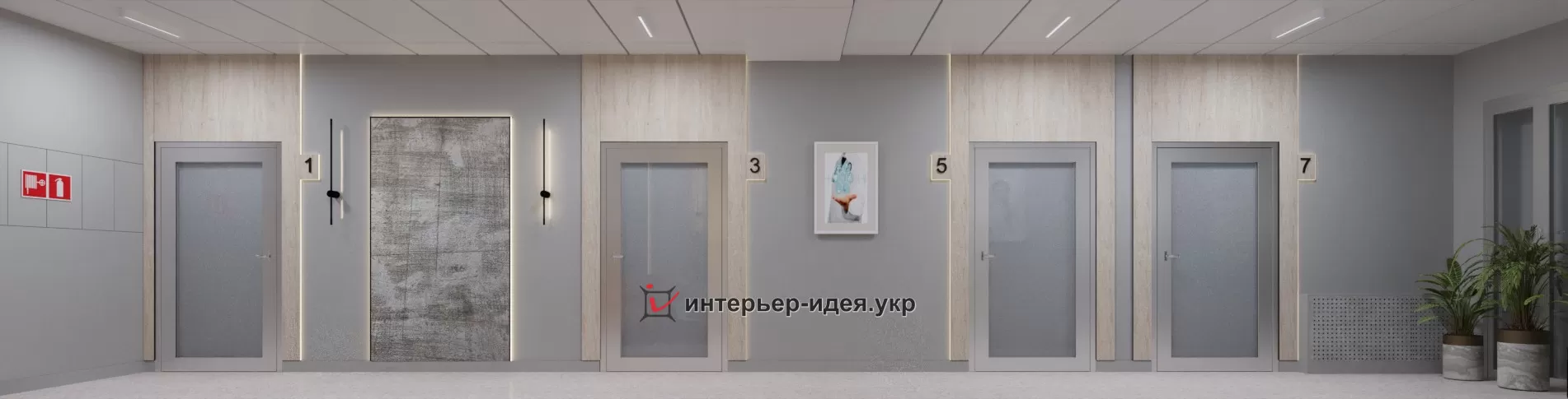 Тема арок продолжена в дальнем коридоре: в оформлении входов в кабинеты использовано дерево с подсветкой панелей с номерами. Акценты – отделка декоративной штукатуркой и минималистичные линейные бра.