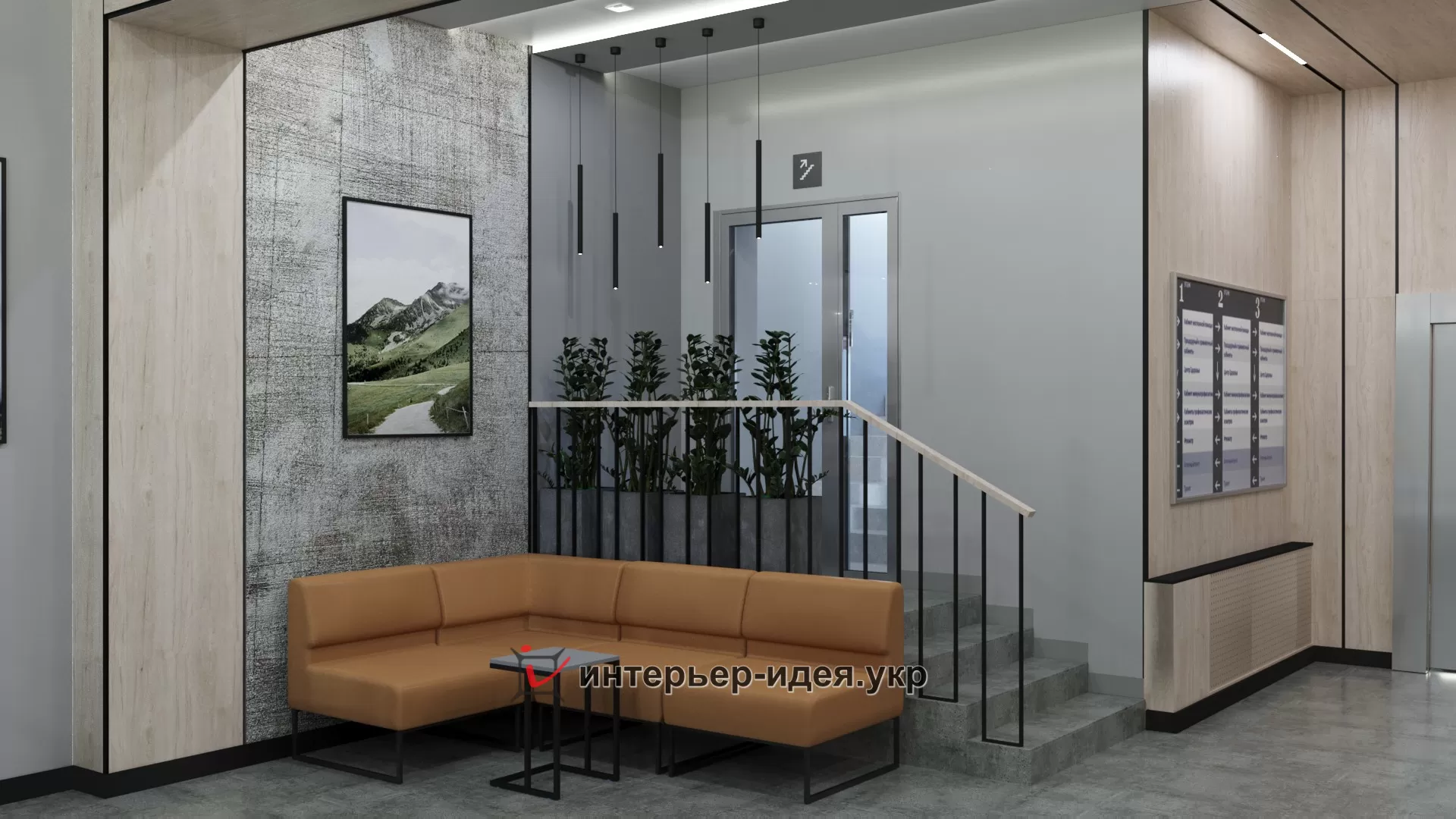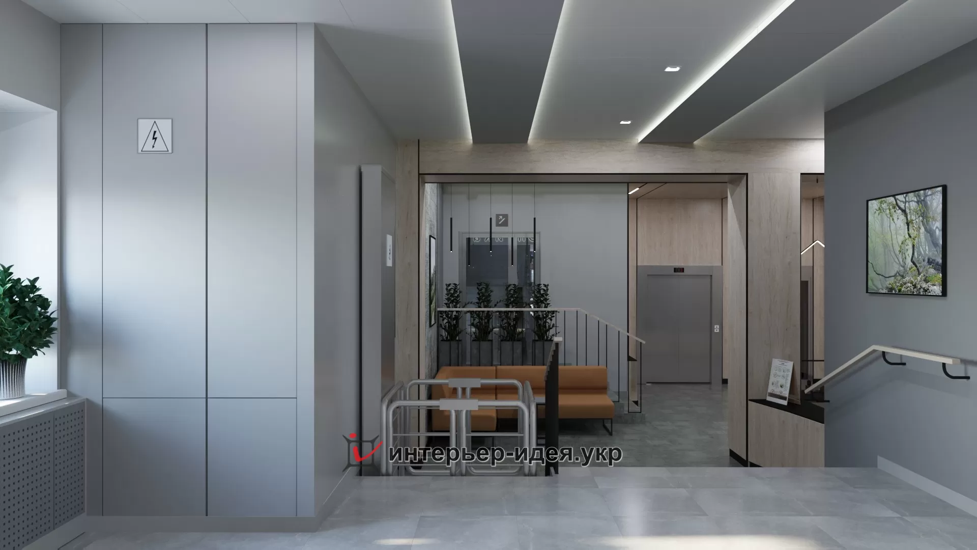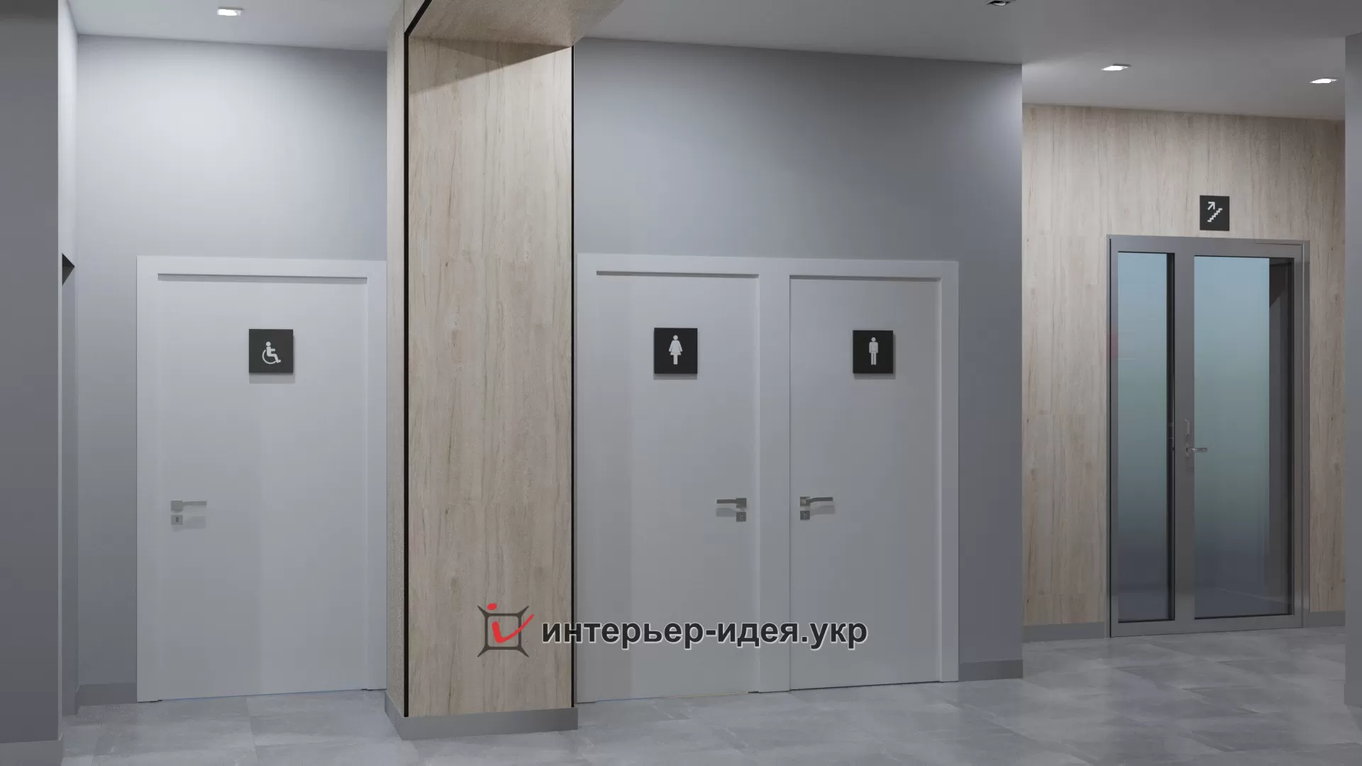 Тема арок продолжена в дальнем коридоре: в оформлении входов в кабинеты использовано дерево с подсветкой панелей с номерами. Акценты – отделка декоративной штукатуркой и минималистичные линейные бра.