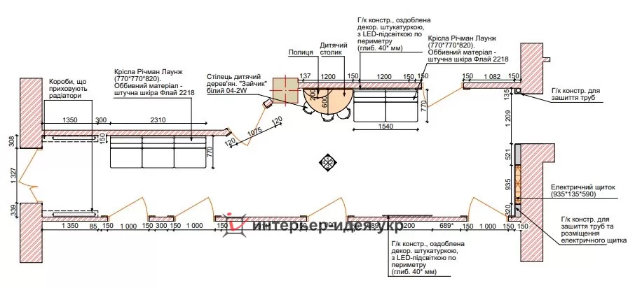 Сложность помещения заключалась в наличии выступающих колонн и балок в холле и коридоре. Было принято решение не скрывать их, а выделить. Таким образом, с отделкой ДСП образовались 2 «деревянные» «арки» и 3-я – дверной проход между коридорами, замаскированный под акру.