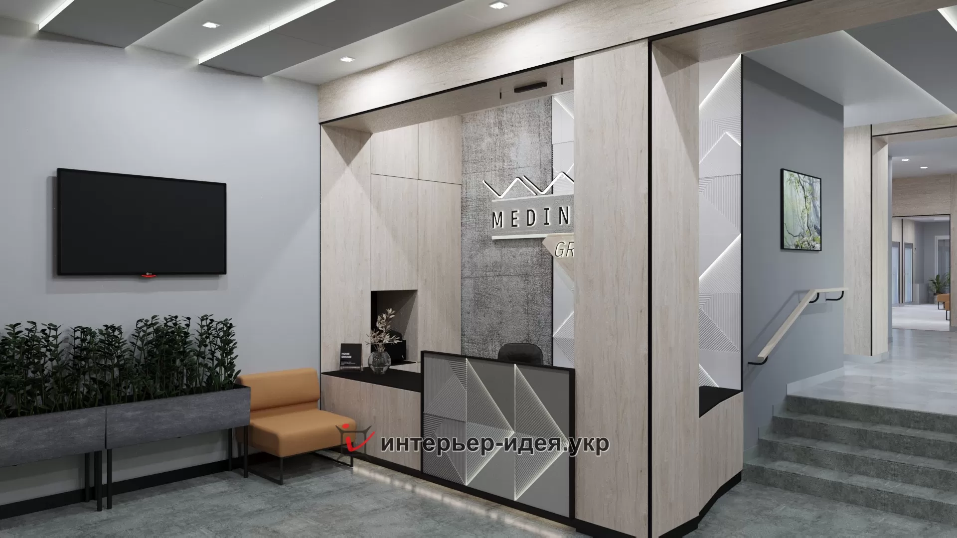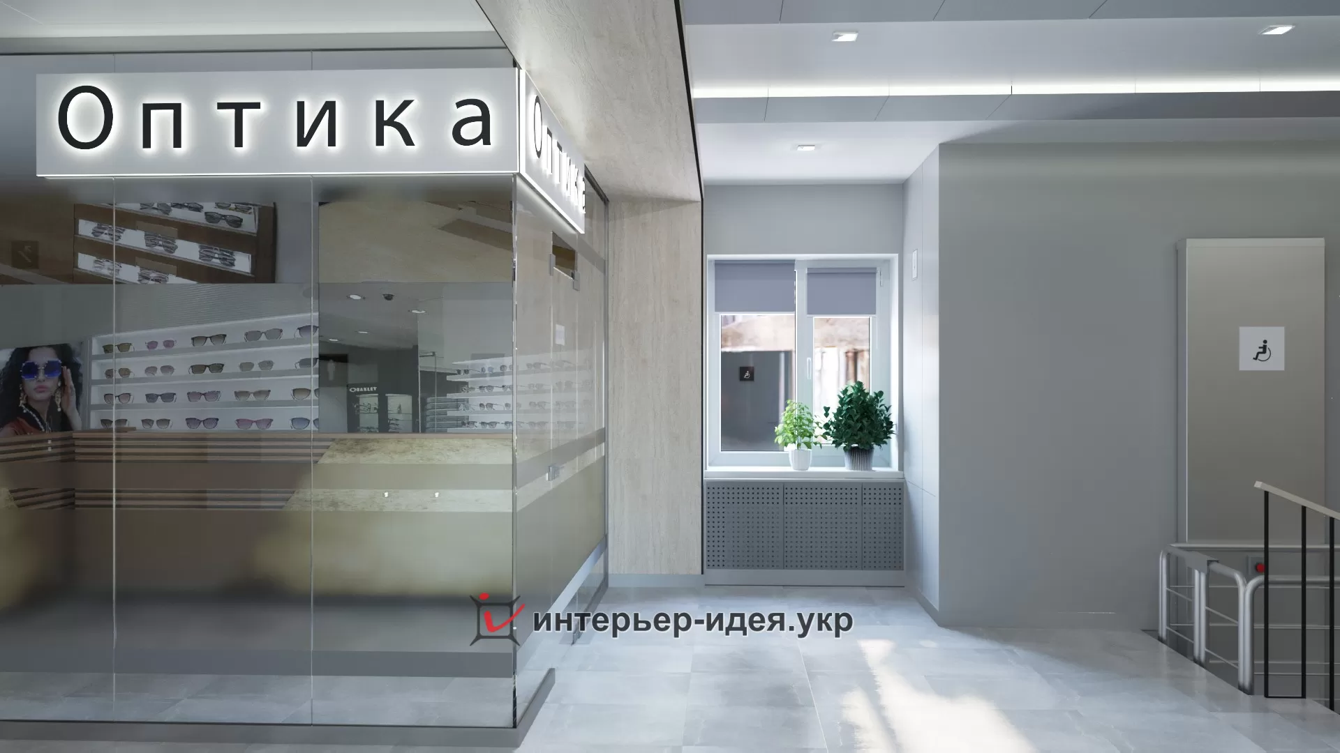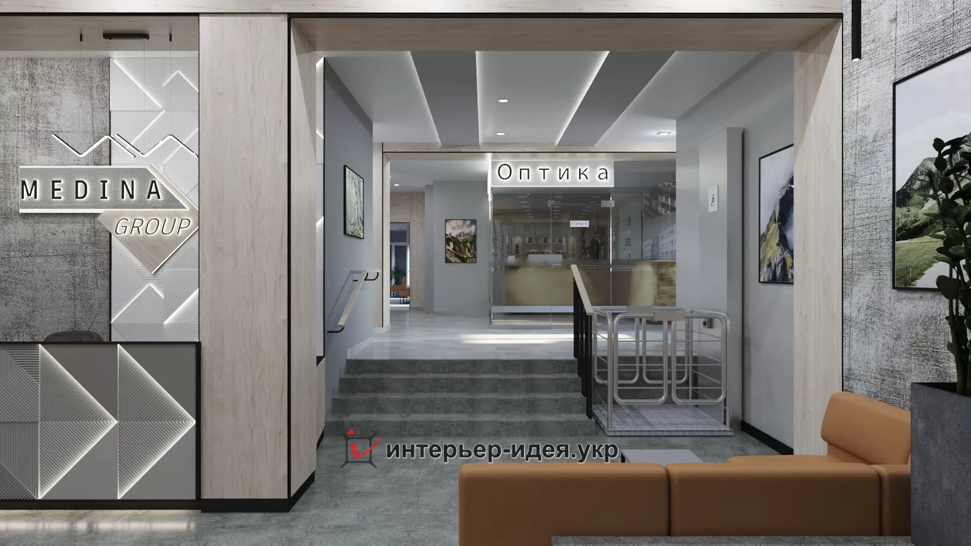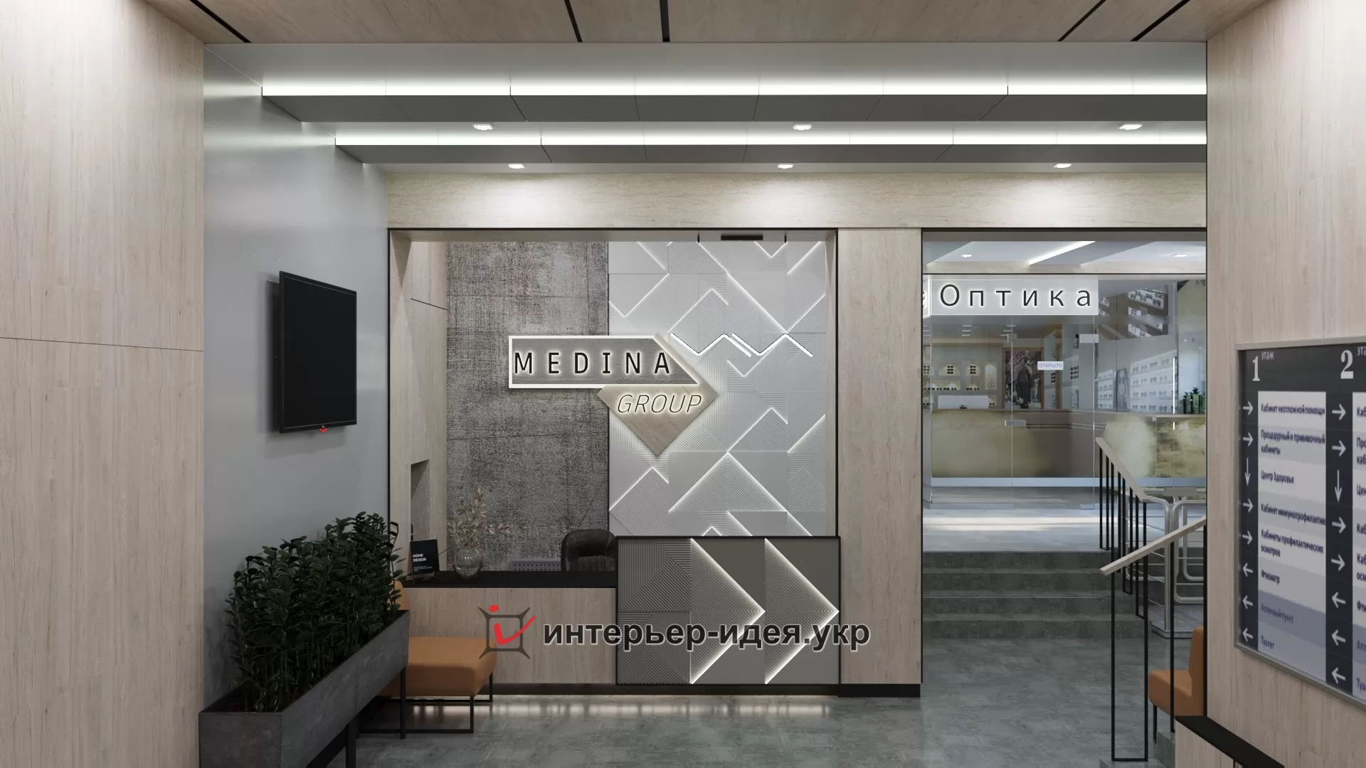 Общее пространство было разделено на функциональные зоны: входная зона; рецепция; зона ожидания; коридор с помещением "Оптики" и коридор с кабинетами врачей.