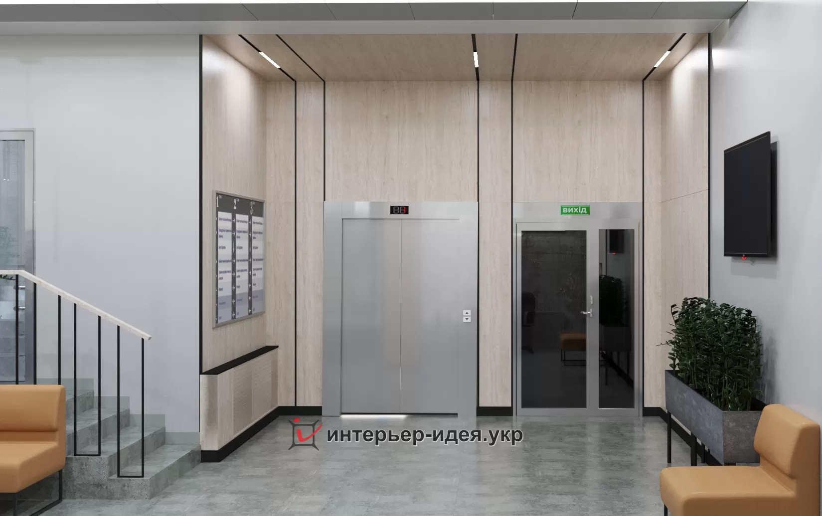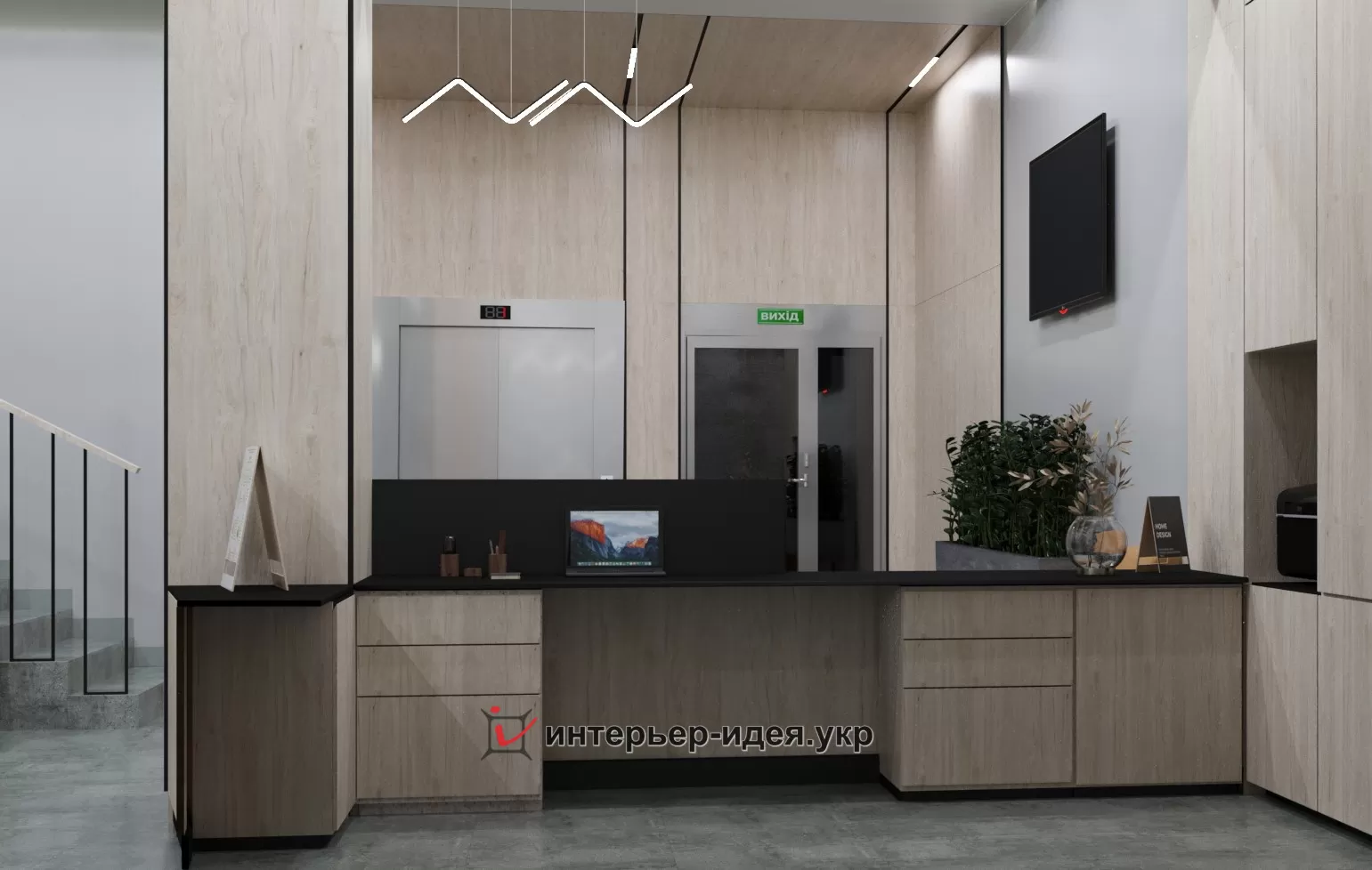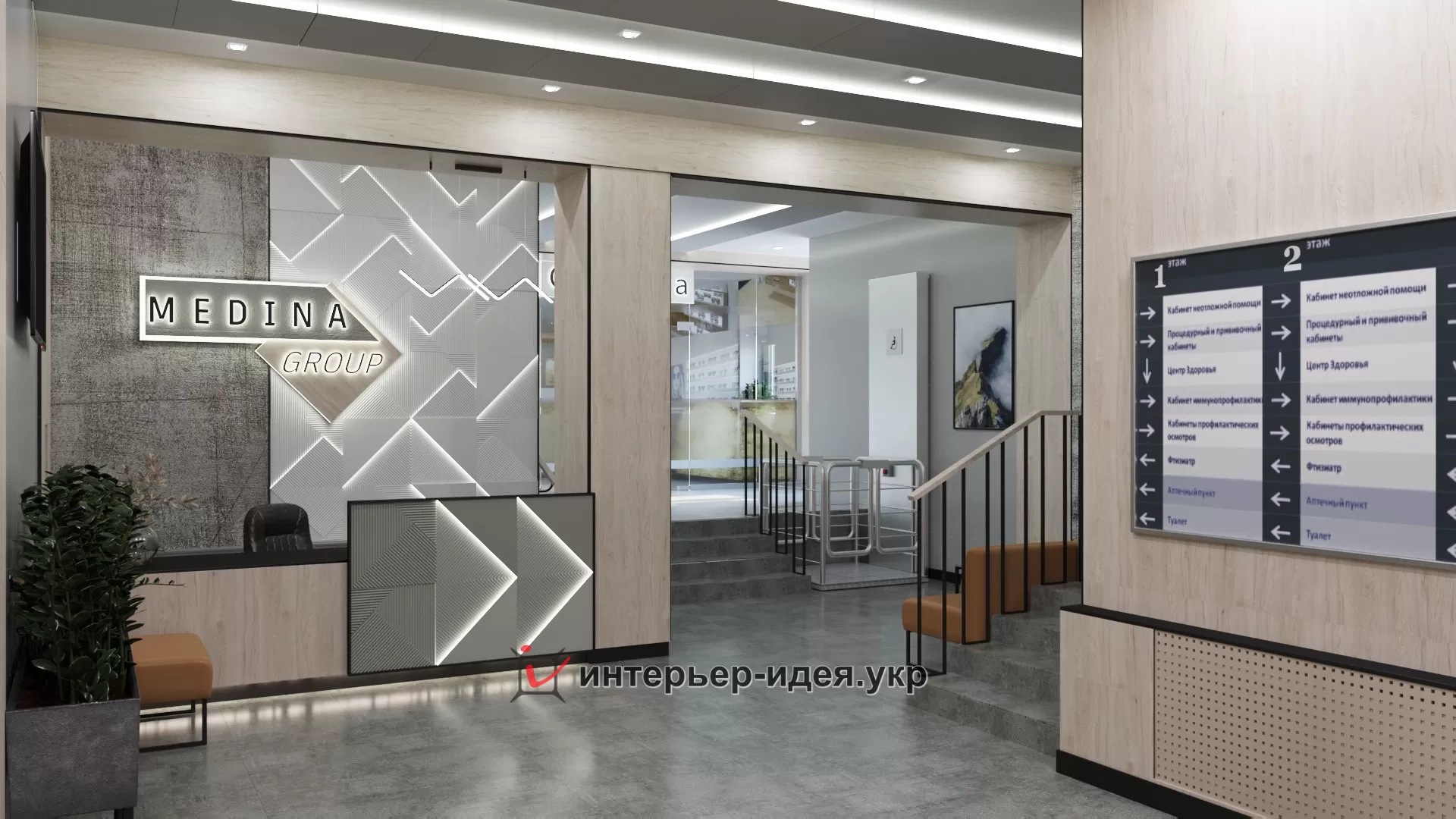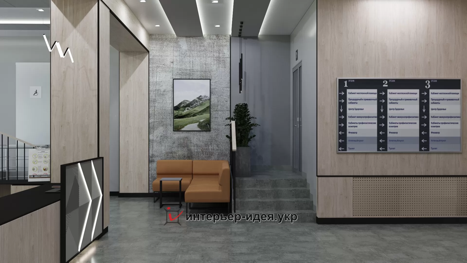 Зона входа в клинику также выделена «деревом». Линейность черных трековых светильников продолжена на стене у входной двери и лифта.
