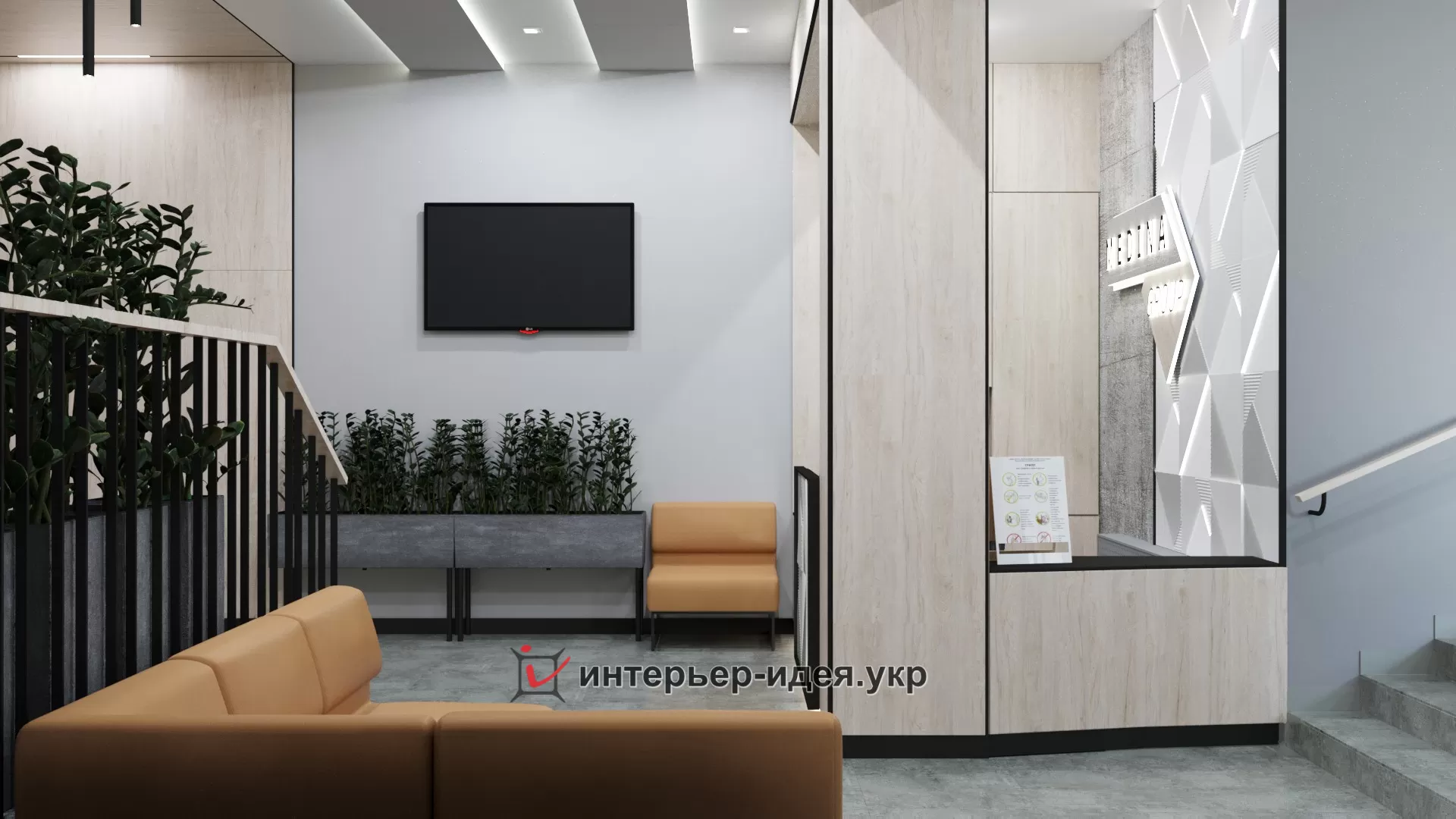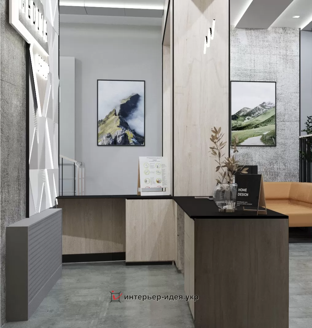 Часть стены в зоне рецепции оформлена белыми гипсовыми панелями с LED-подсветкой, что создало объем и интересную игру линий. Эти же панели использованы для оформления мебели рецепции. Рядом – отделка декоративной штукатуркой «под бетон». Такая же отделка стены использована в зоне ожидания.