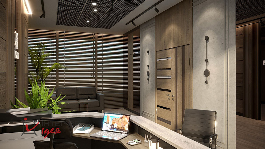 У противоположной стены, справа от входа, находится рецепция и пара стульев для посетителей. Стена по рецепции оформлена горизонтальными деревянными панелями разных оттенков и вертикальной вставкой из черного стекла, на которой расположен логотип предприятия.