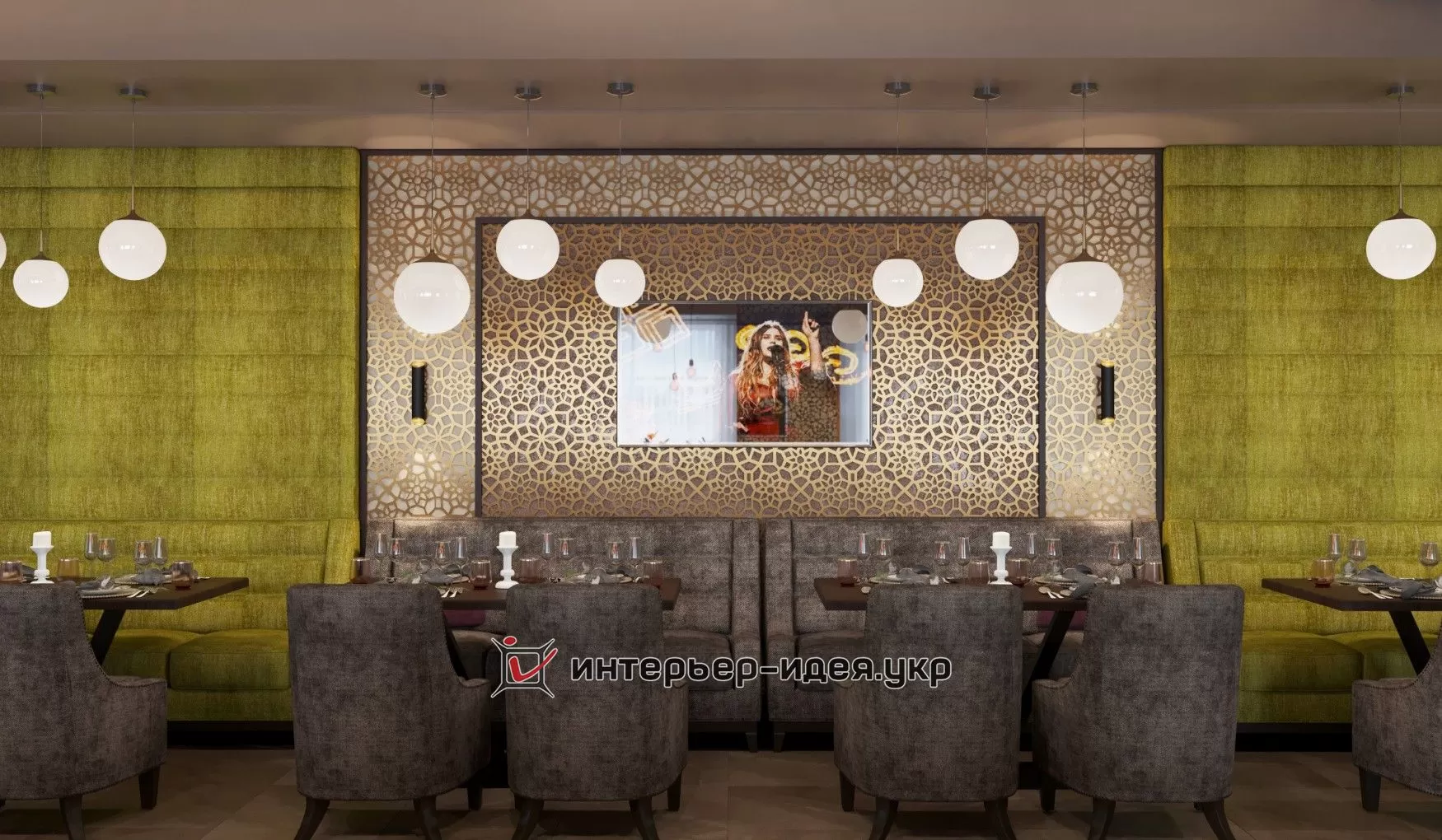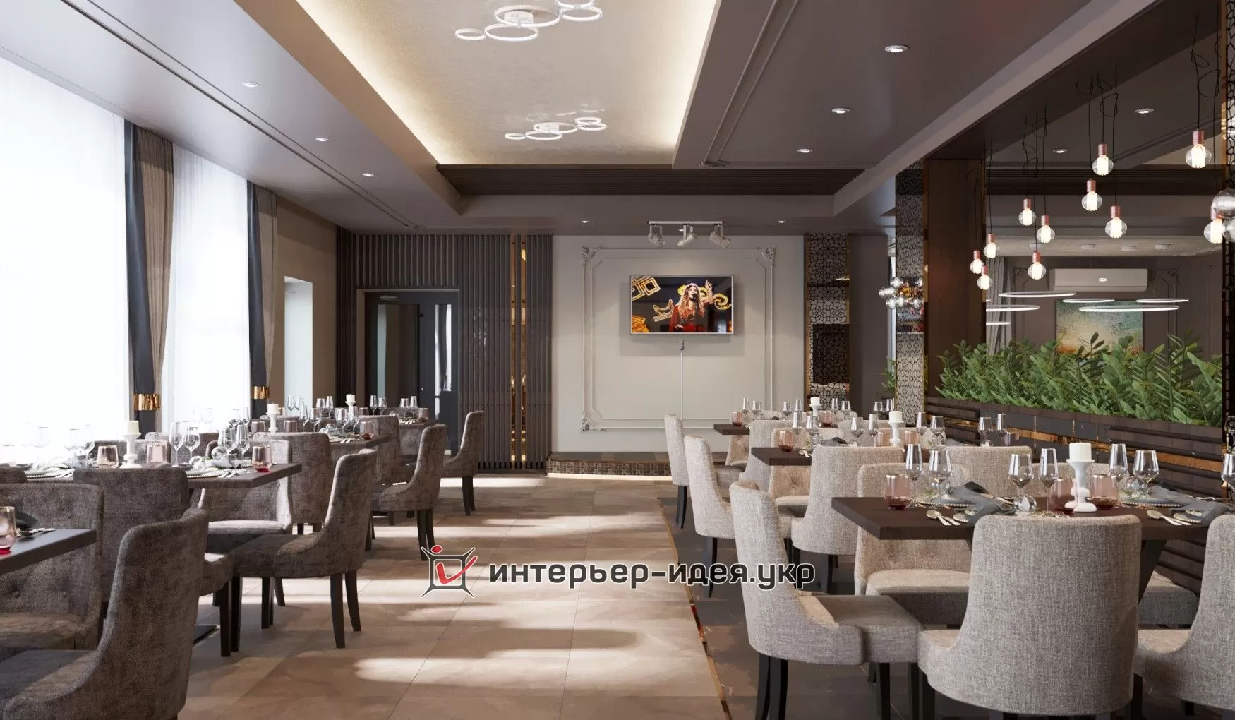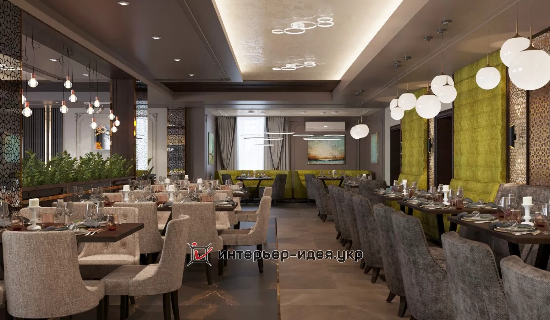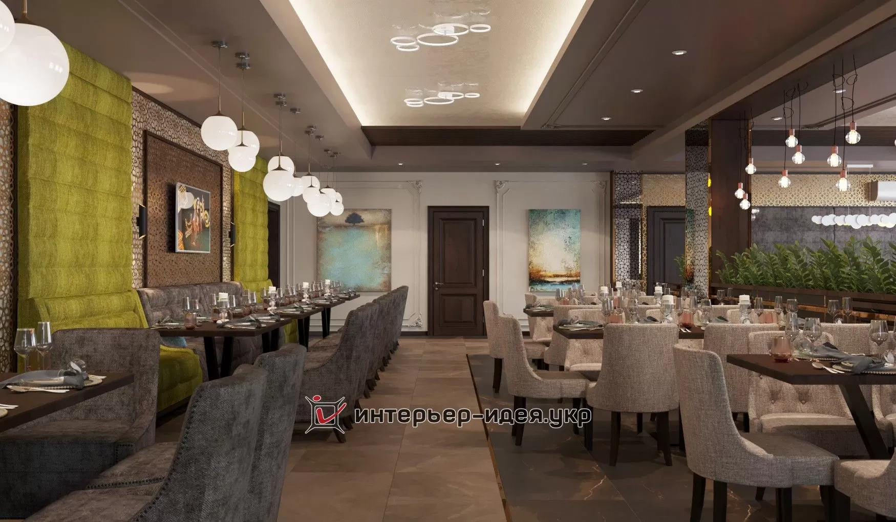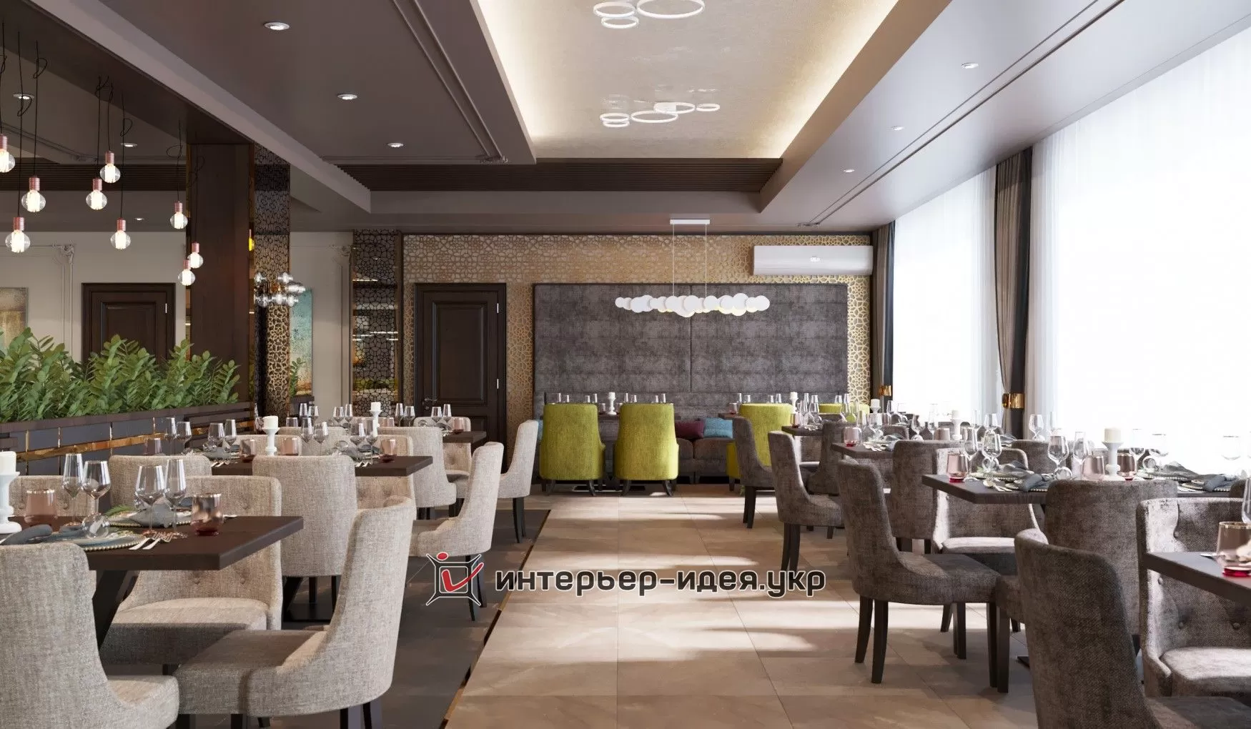 2) наличие вентиляционной запотолочной системы по всему ресторану. Ее размещения учитывали при дизайне и оформлении потолка.