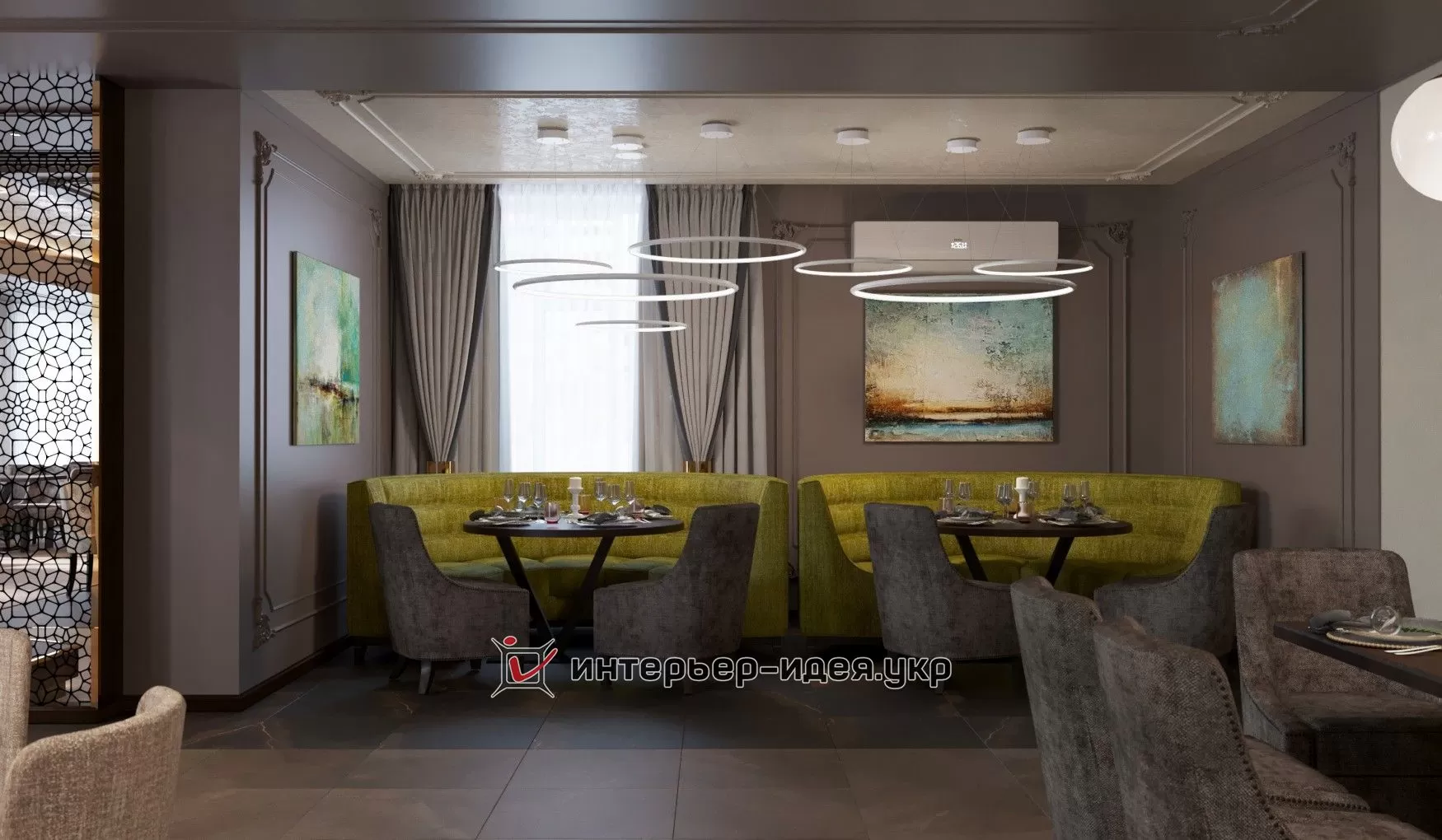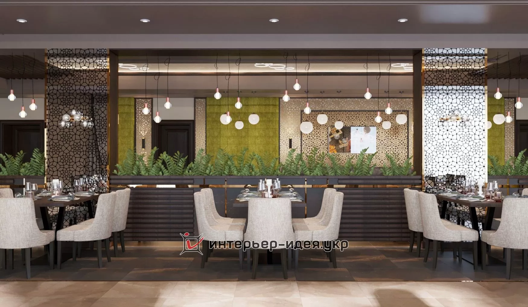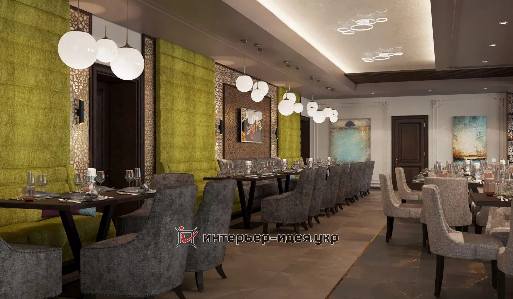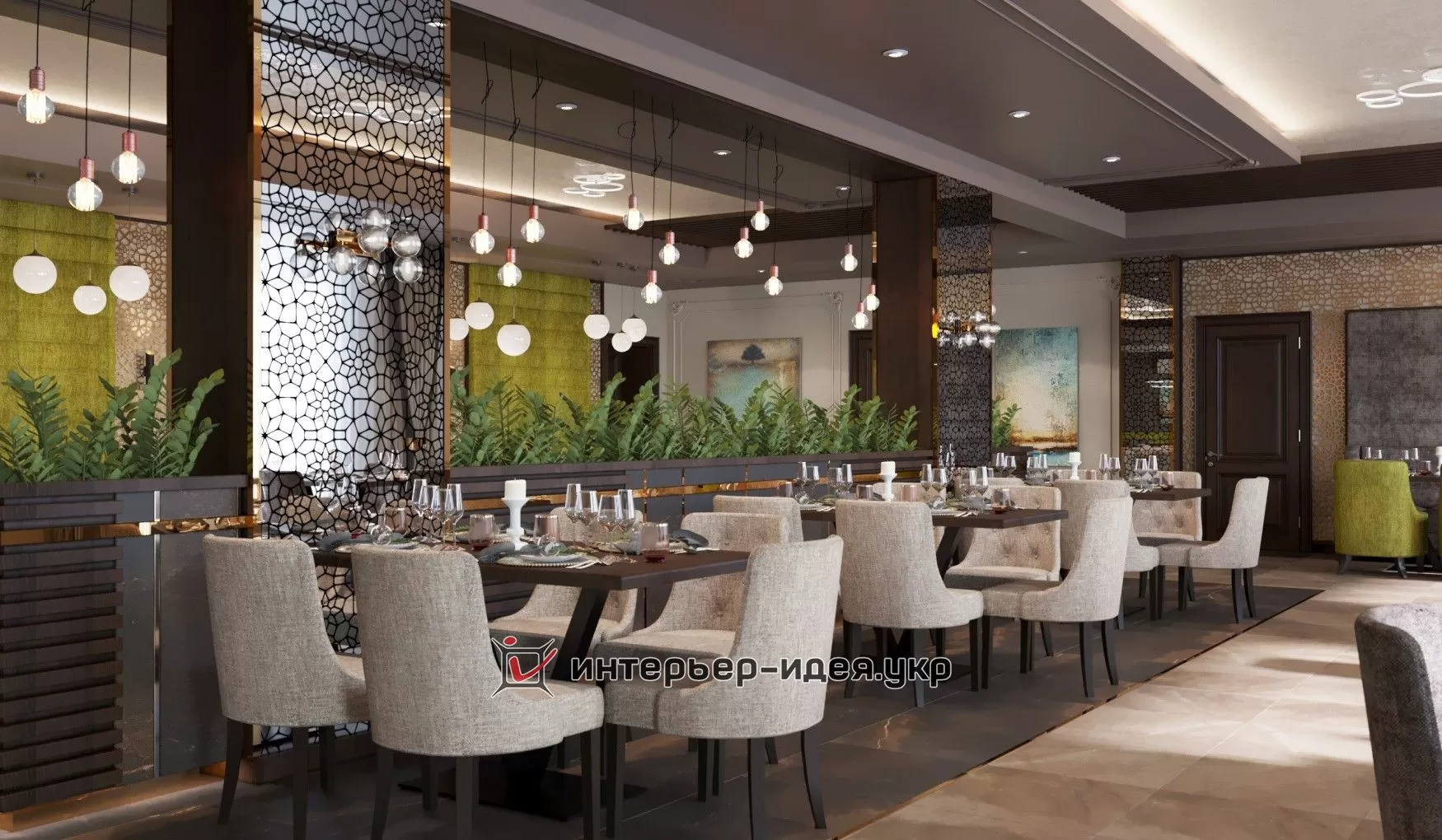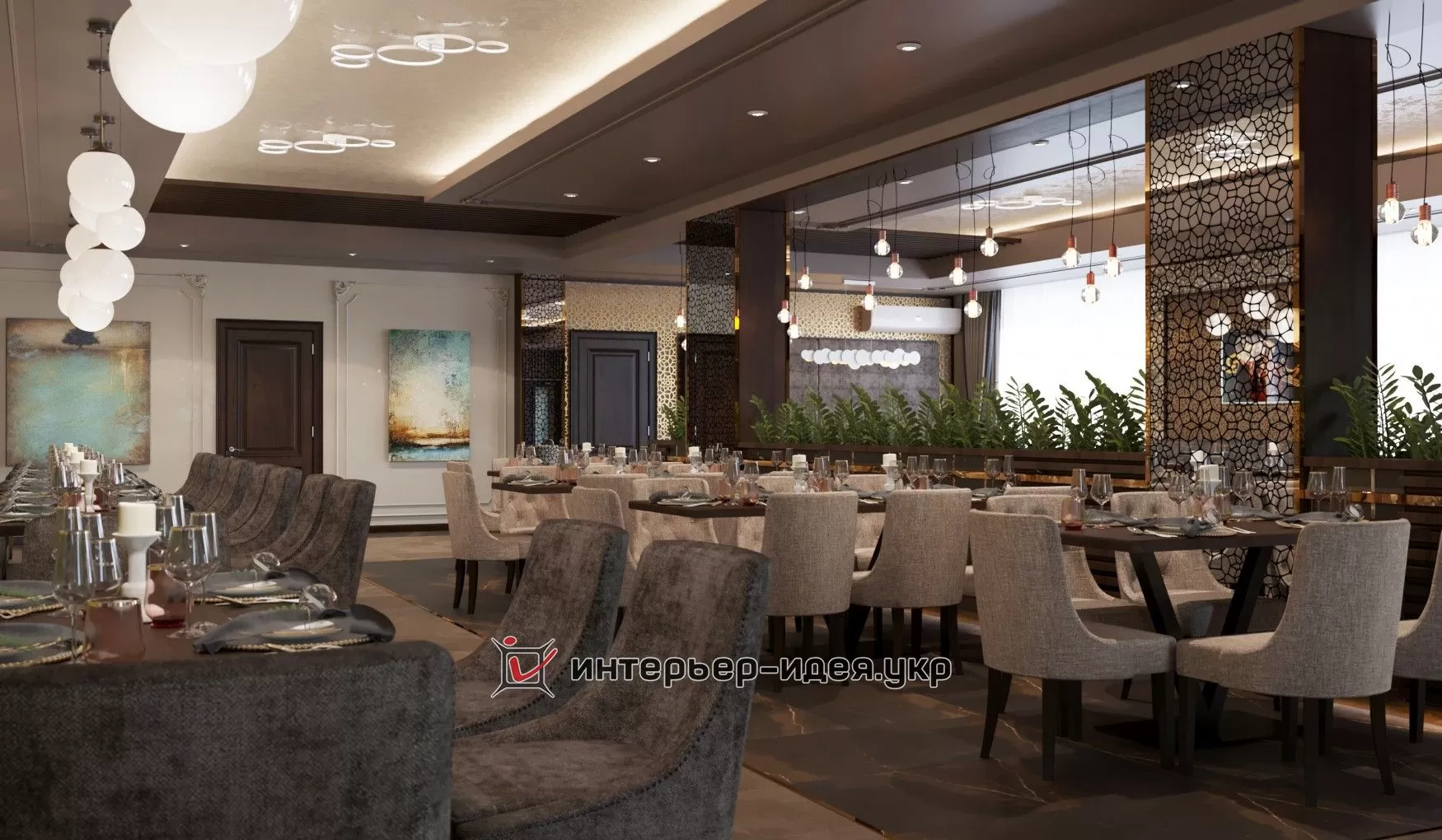 Главной задачей было создание дизайна ресторана, который можно использовать и для торжественных праздников, и для индивидуальных посещений небольшими компаниями.